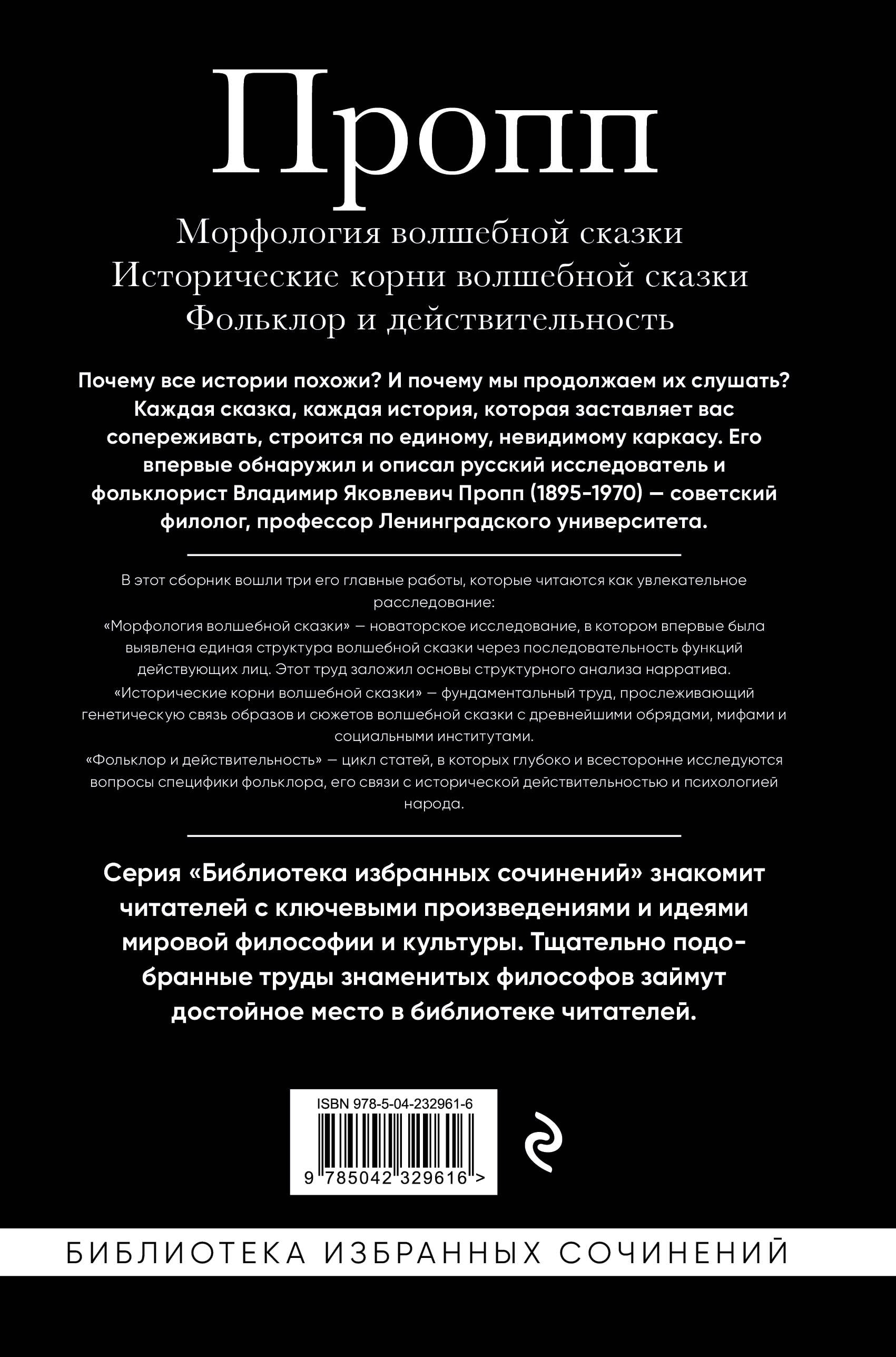 В нашей серии «Библиотека избранных сочинений» долгожданное пополнение, которое может стать главным инструментом для всех создателей контента. Перед вами - первоисточник, фундаментальные работы выдающегося фольклориста Владимира Проппа, где впервые были сформулированы законы построения сюжета, актуальные и сегодня. Именно открытиями Проппа вдохновлялись Кристофер Воглер («Путешествие писателя») и десятки авторов современных бестселлеров о сторителлинге. Труд, без которого невозможно представить современное искусство повествования. Почему эту книгу называют «библией сценариста»? В отличие от многих современных пособий, эта классика предлагает не временные советы, а проверенную временем систему. Вы не просто узнаете о приёмах - вы поймёте саму природу повествования. Кому необходим этот труд: • Писателям и сценаристам - для создания безупречных сюжетных линий. • Гейм-дизайнерам - для построения захватывающих игровых вселенных. • Маркетологам и бренд-менеджерам - для создания цепляющих бренд-историй. Практическая ценность издания: Это не просто академический труд, а рабочий инструмент с готовыми схемами и моделями, которые можно сразу применять в творчестве. Вы получите ключ к пониманию того, почему одни истории трогают сердца, а другие забываются сразу после прочтения.