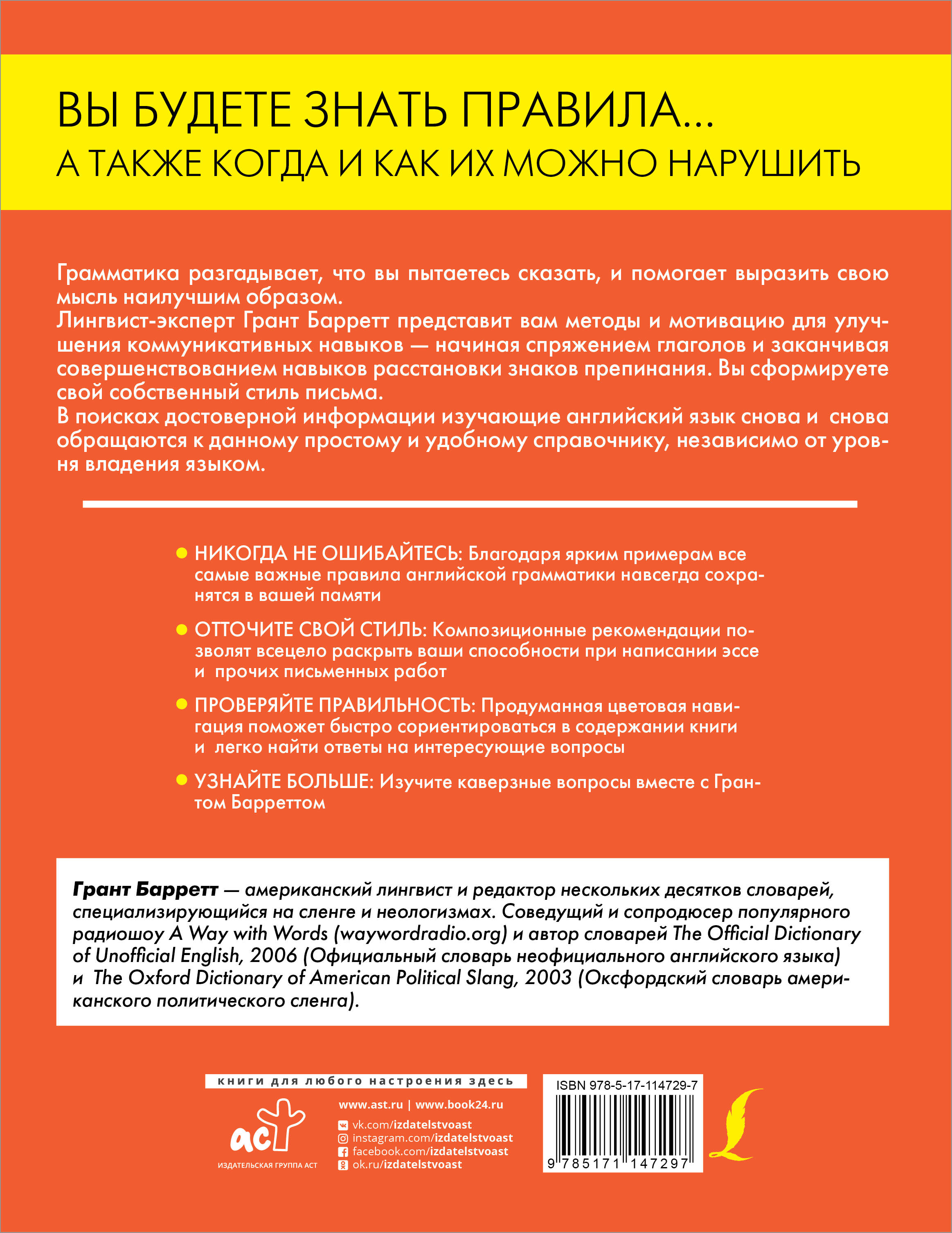Вы будете знать правила… А также когда и как их можно нарушить Грамматика разгадывает, что вы пытаетесь сказать, и помогает выразить свою мысль наилучшим образом. Лингвист-эксперт Грант Барретт представит вам методы и мотивацию для улучшения коммуникативных навыков - начиная спряжением глаголов и заканчивая совершенствованием навыков расстановки знаков препинания. Вы сформируете свой собственный стиль письма. В поисках достоверной информации изучающие английский язык снова и снова обращаются к данному простому и удобному справочнику, независимо от уровня владения языком. • НИКОГДА НЕ ОШИБАЙТЕСЬ: Благодаря ярким примерам все самые важные правила английской грамматики навсегда сохранятся в вашей памяти • ОТТОЧИТЕ СВОЙ СТИЛЬ: композиционные рекомендации позволят всецело раскрыть ваши способности при написании эссе и прочих письменных работ • ПРОВЕРЯЙТЕ ПРАВИЛЬНОСТЬ: продуманная цветовая навигация поможет быстро сориентироваться в содержании книги и легко найти ответы на интересующие вопросы • УЗНАЙТЕ БОЛЬШЕ: изучите каверзные вопросы вместе c Грантом Барреттом Грант Барретт - американский лингвист и редактор нескольких десятков словарей, специализирующийся на сленге и неологизмах. Соведущий и сопродюсер популярного радиошоу A Way with Words (waywordradio.org) и автор словарей The Official Dictionary of Unofficial English, 2006 (Официальный словарь неофициального английского языка) и The Oxford Dictionary of American Political Slang, 2003 (Оксфордский словарь американского политического сленга). Личный сайт: grantbarrett.com.| Издательство | ИЗДАТЕЛЬСТВО "АСТ" |