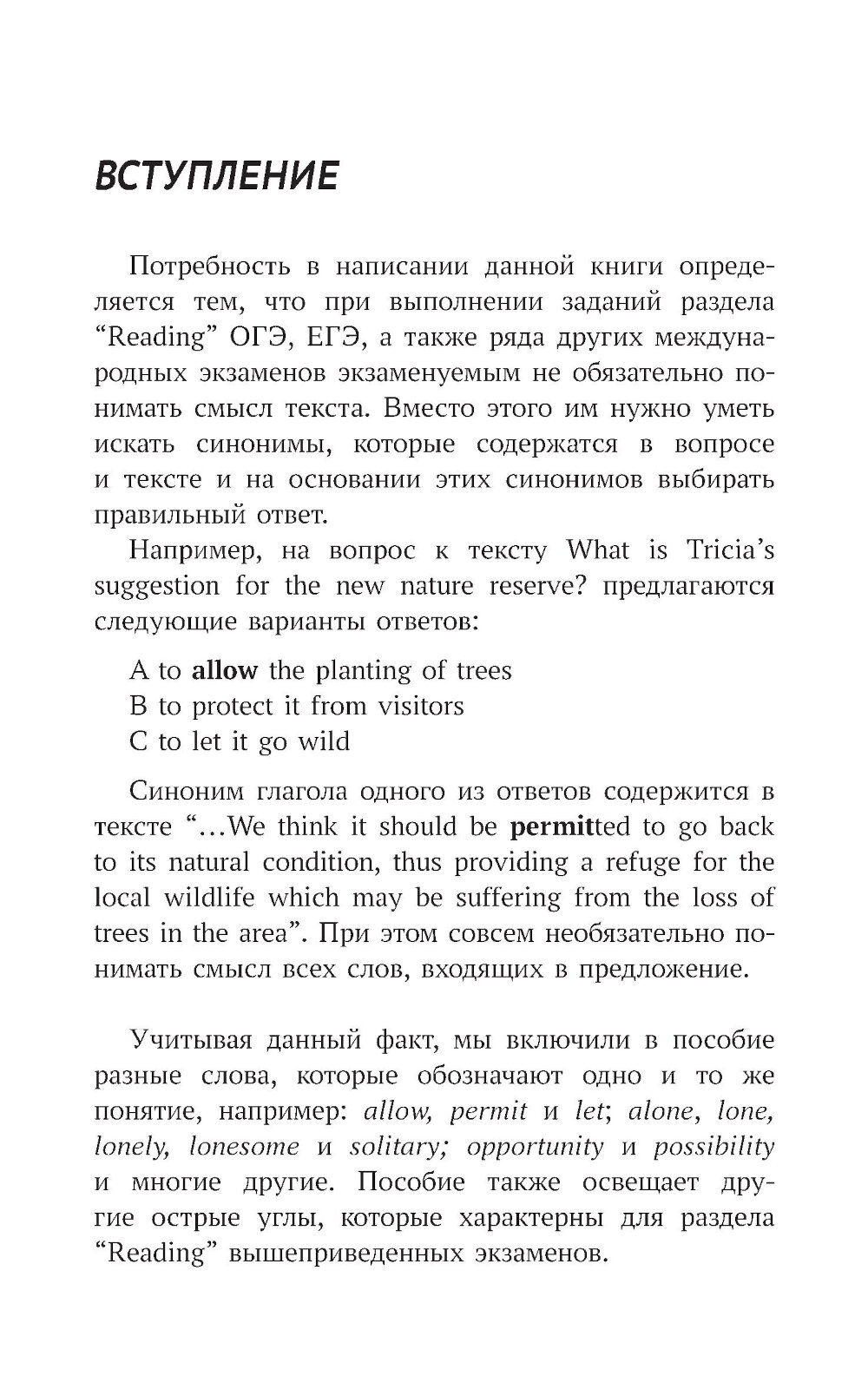 Данное пособие составлено на основе стандарта среднего (полного) общего образования по английскому языку. Материал ориентирован на решение конкретной задачи - успешное выполнение заданий раздела "Reading" экзаменов ОГЭ, ЕГЭ, IELTS, TOEIC, FCE, CAE, СРЕ.