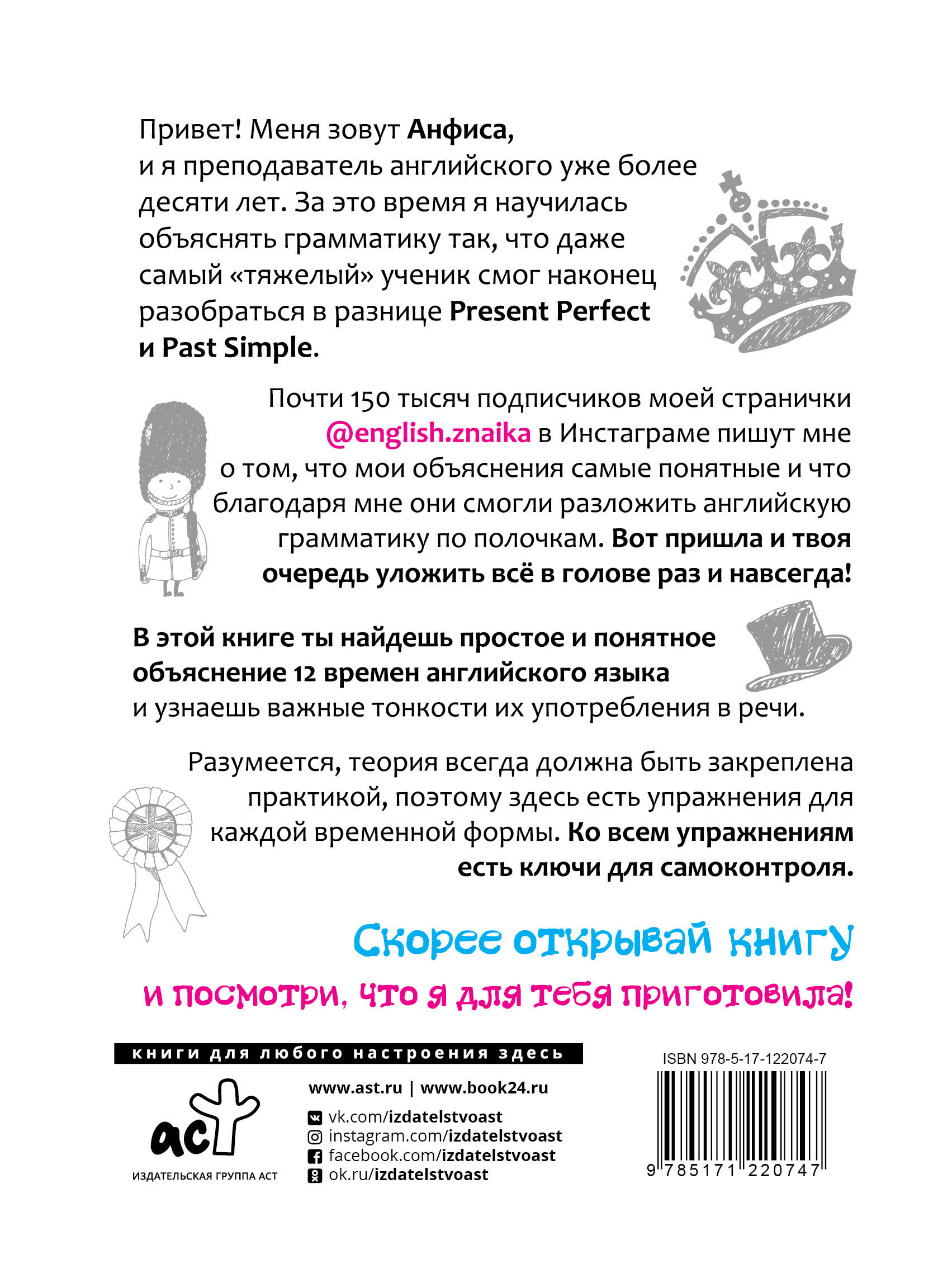 Привет! Меня зовут Анфиса, и я преподаватель английского уже более десяти лет. За это время я научилась объяснять грамматику так, что даже самый "тяжелый" ученик смог наконец разобраться в разнице Present Perfect и Past Simple. Почти 150 тысяч подписчиков моей странички @english.znaika в Инстаграме пишут мне о том, что мои объяснения самые понятные и что благодаря мне они смогли разложить английскую грамматику по полочкам. Вот пришла и твоя очередь уложить всё в голове раз и навсегда! В этой книге ты найдешь простое и понятное объяснение 12 времен английского языка и узнаешь важные тонкости их употребления в речи. Разумеется, теория всегда должна быть закреплена практикой, поэтому здесь есть упражнения для каждой временной формы. Ко всем упражнениям есть ключи для самоконтроля. Скорее открывай книгу и посмотри, что я для тебя приготовила!| Издательство | Издательство "АСТ" |