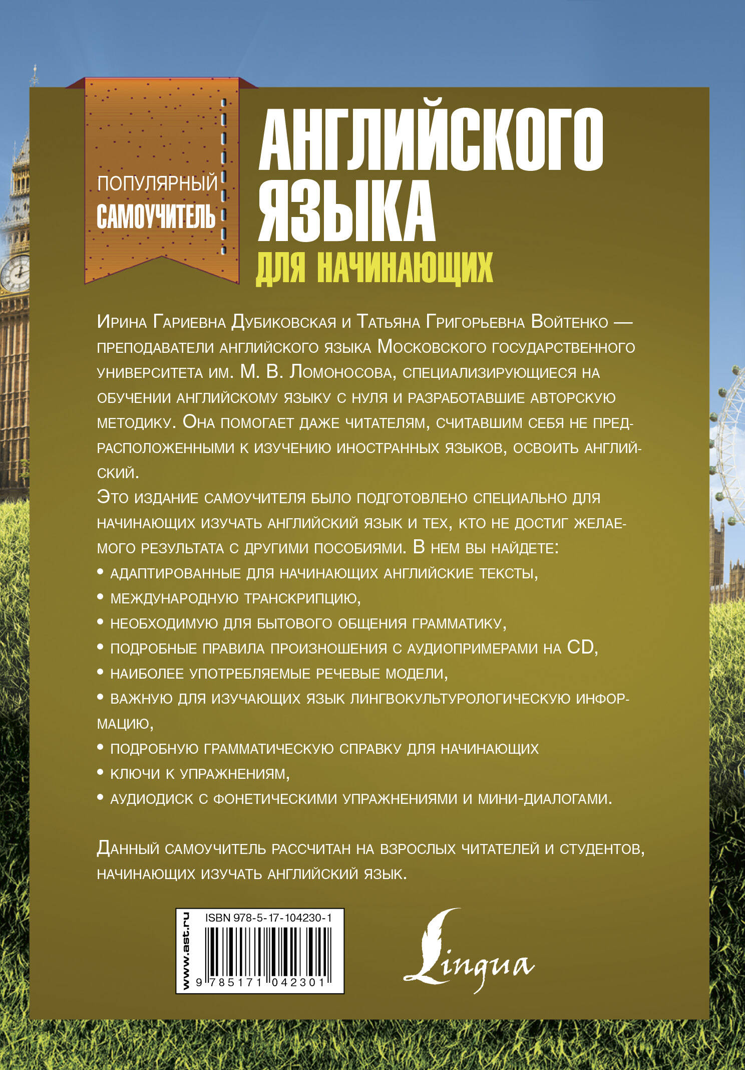 Это издание самоучителя было подготовлено специально для начинающих изучать английский язык и тех, кто не достиг желаемого результата с другими пособиями. В нем вы найдете: • адаптированные для начинающих английские тексты, • международную транскрипцию, • необходимую для бытового общения грамматику, • подробные правила произношения с аудиопримерами на CD, • наиболее употребляемые речевые модели, • важную для изучающих язык лингвокультурологическую информацию, • подробную грамматическую справку для начинающих, • ключи к упражнениям, • аудиодиск с фонетическими упражнениями и мини-диалогами, содержащий 109 треков! Ирина Гариевна Дубиковская и Татьяна Григорьевна Войтенко - преподаватели английского языка Московского государственного университета им. М. В. Ломоносова, специализирующиеся на обучении английскому языку с нуля и разработавшие авторскую методику. Она помогает даже читателям, считавшим себя не предрасположенными к изучению иностранных языков, освоить английский.| Издательство | ИЗДАТЕЛЬСТВО "АСТ" |