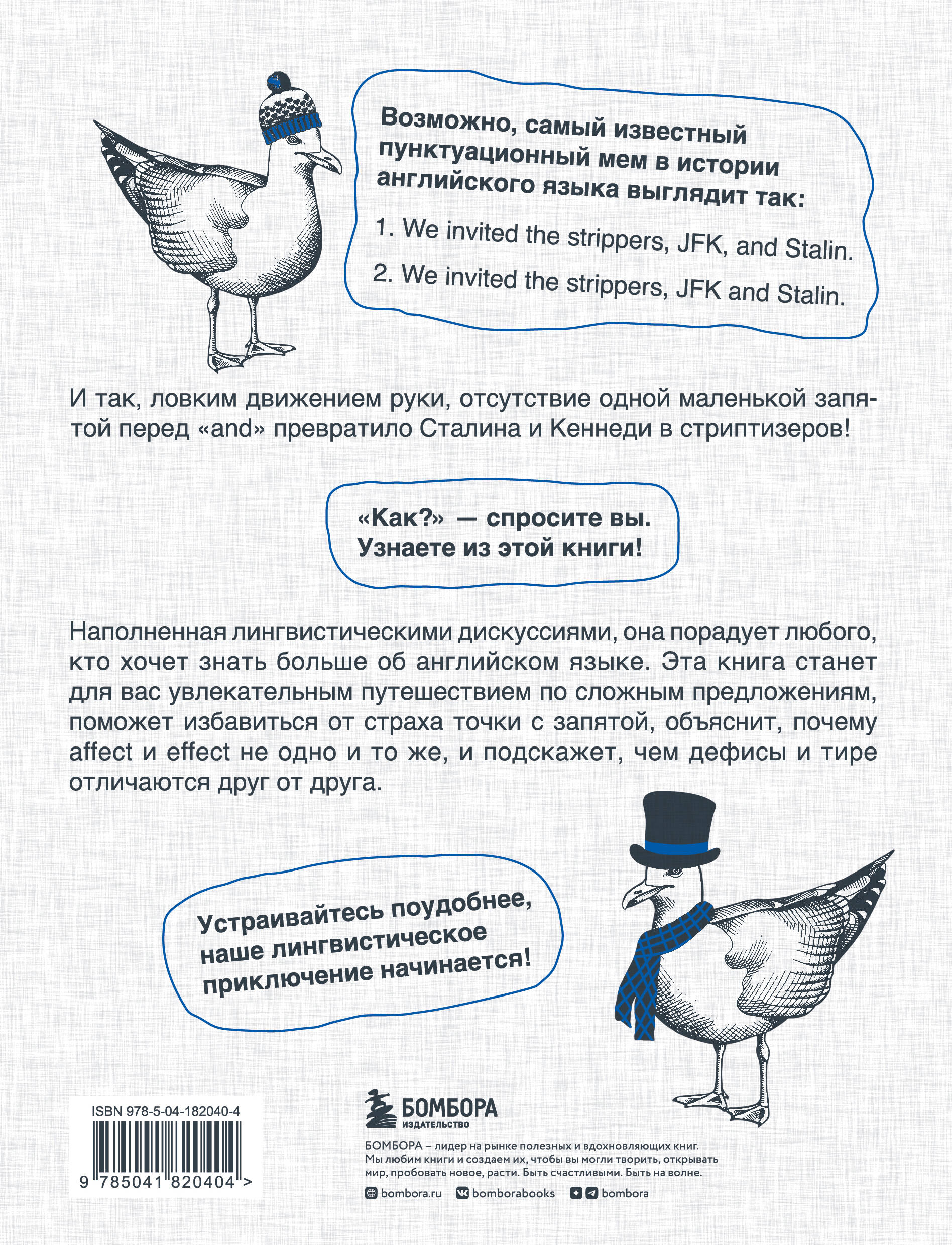 Самый известный пунктуационный мем в истории английского языка выглядит так: 1. We invited the strippers, JFK, and Stalin. 2. We invited the strippers, JFK and Stalin. И так, ловким движением руки отсутствие одной маленькой запятой перед «and» превратило Сталина и Кеннеди в стриптизеров! «Как?» - спросите вы. Узнаете из этой книги! Наполненная лингвистическими дискуссиями, она порадует любого, кто хочет знать больше об английском языке. Эта книга станет для вас увлекательным путешествием по сложным предложениям, поможет избавиться от страха точки с запятой, объяснит, почему affect и effect не одно и то же, и подскажет, чем дефисы и тире отличаются друг от друга. Устраивайтесь поудобнее, наше лингвистическое приключение начинается!| Издательство | ООО "Издательство "Эксмо" |