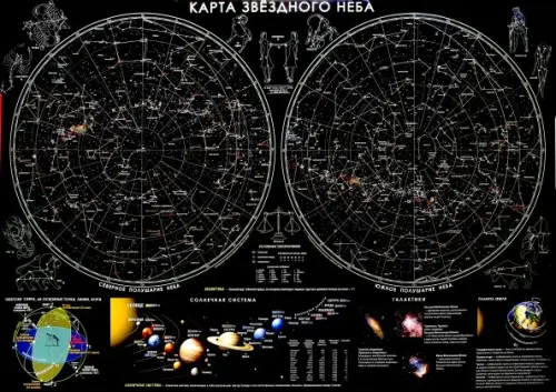 Карта звездного неба. Показаны Северное и Южное полушария, даны подробные сведения о планете Земля и других планетах Солнечной Системы, художественные изображения зодиакальных созвездий. Размер: 1,0х0,7 м Изготовлено из мелованного картона.