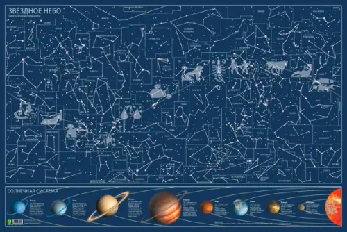 Карта звездного неба на картоне. Светится в темноте. Карта отпечатана на картоне. Звезды (созвездия) покрыты специальной краской, светящейся в темноте. Для этого нужно предварительно зарядить карту дневным светом. Кроме этого при дневном свете вы можете изучать небесные созвездия, а так же нашу Солнечную систему. Такая карта будет прекрасным и оригинальным подарком.