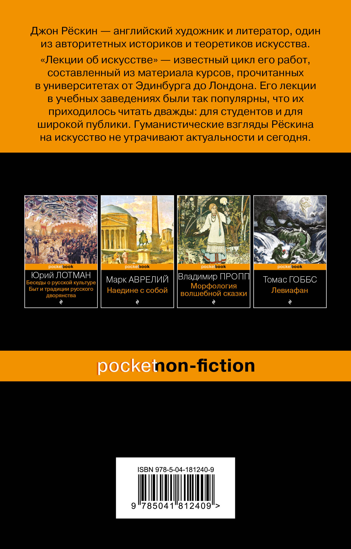 Джон Рёскин - английский художник, литератор, теоретик искусства и один из авторитетнейших историков искусства и искусствоведов. «Лекции об искусстве» - один из известнейших циклов его работ, в котором он выступает и как историк, и как теоретик современного ему искусства, берет лучшие примеры из различных эпох и встраивает их в единую систему развития художественного творчества. Гуманистические взгляды Рёскина на искусство не утрачивают актуальности и сегодня.| Издательство | ООО "Издательство "Эксмо" |