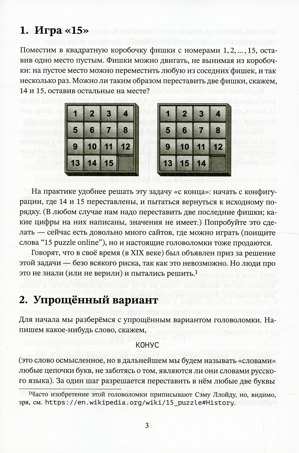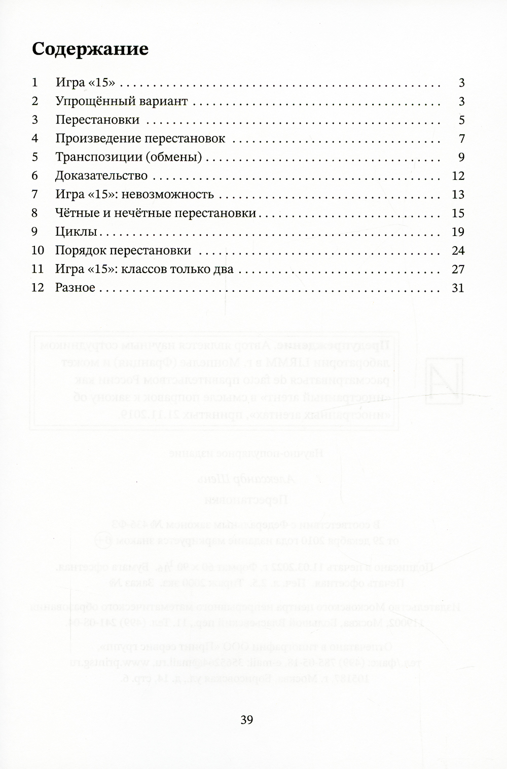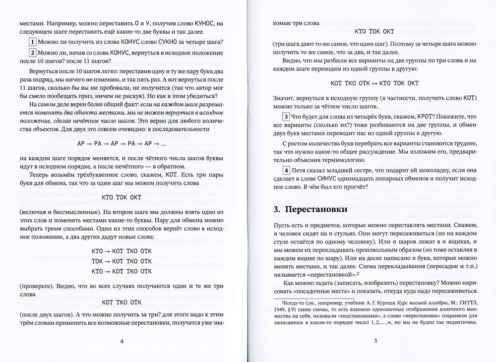 В жизни «перестановками» называют самые разные вещи; эта книжка содержит начальные сведения о том, что математики называют «группой перестановок конечного множества». Мы покажем, как можно разделить перестановки на «чётные» и «нечётные» и как это помогает проанализировать известную головоломку c 15 фишками в квадрате 4?4, как перестановка разлагается в циклы и почему это бывает полезно, почему повторение одного и того же действия с «кубиком Рубика» рано или поздно вернёт его в исходное положение, и разберём задачи, при решении которых перестановки оказываются полезными. Обычно эти вопросы относят к курсам «высшей алгебры» для студентов младших курсов, но они вполне элементарны, и никаких сведений, выходящих за пределы средних классов школы, мы не используем. (Хотя, конечно, привычка к несложным математическим рассуждениям пригодится.)