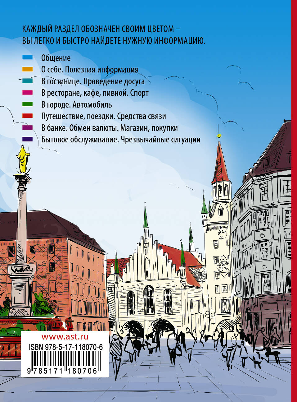 Немецкий разговорник содержит самые необходимые темы и наиболее типичные модели фраз и выражений. Немецкий текст снабжен практической транскрипцией, передающей звуки немецкого языка средствами русской графики. Каждый раздел обозначен своим цветом - вы легко и быстро найдете нужную информацию. Разговорник предназначен для всех, кто выезжает за границу и хочет иметь с собой в поездке надежного помощника.| Издательство | ИЗДАТЕЛЬСТВО "АСТ" |