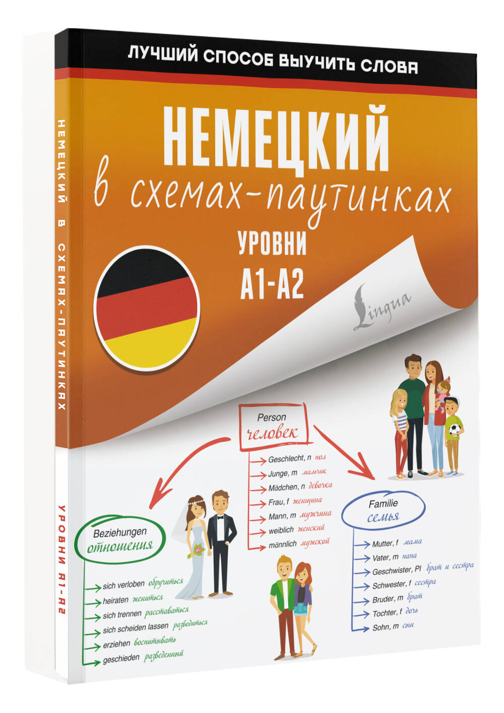"Немецкий в схемах-паутинках" - это пособие нового поколения с уникальной методикой запоминания слов, которая систематизирует пополнение словарного запаса и делает процесс обучения осмысленным и интересным. Книга представляет собой сборник из более чем 25 интеллект-карт - наглядных схем-списков основных слов, составленных по тематическим блокам (Человек, Отношения, Личность и др.) и соответствующих уровням А1-А2. Для удобного поиска нужного слова в конце издания приводится алфавитный указатель. Особенностью схем-паутинок является визуальное представление ключевых понятий, которое отражает системные связи между центральной темой и ее частями, благодаря чему информация запоминается лучше, а сложные вещи воспринимаются гораздо проще и быстрее. Издание будет полезно всем, кто изучает немецкий язык, а также тем, кто готов использовать новые инструменты для успешного освоения иностранного языка.| Издательство | ИЗДАТЕЛЬСТВО "АСТ" |