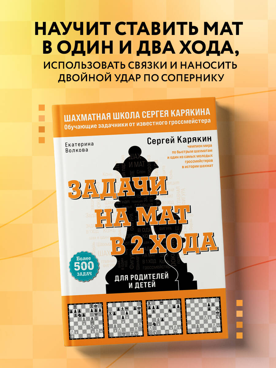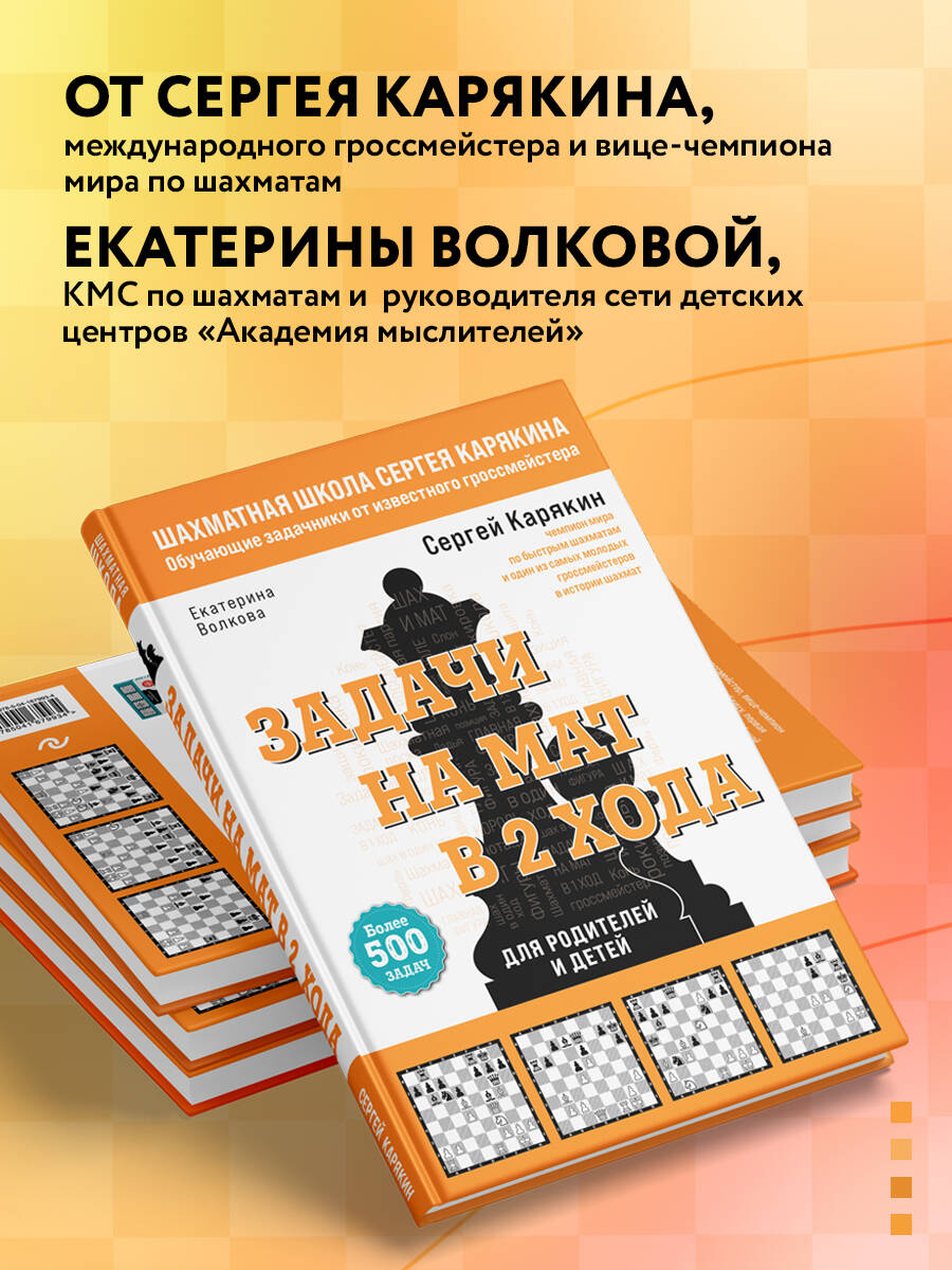 Сергей Карякин - международный гроссмейстер, вице-чемпион мира по шахматам, чемпион мира по быстрым шахматам и блицу, первая доска сборной России по шахматам, член Общественной палаты Российской Федерации, самый молодой гроссмейстер в мире. Екатерина Волкова - кандидат в мастера спорта по шахматам, лицензированный тренер Международной шахматной федерации (ФИДЕ), автор более 10 книг о шахматах, руководитель сети детских центров «Академия мыслителей». «Задачи на мат в 2 хода» - вторая книга серии шахматных задачников ведущего шахматиста мира Сергея Карякина. Задачник содержит более 500 заданий на мат в один и два хода и выигрыш материального преимущества. Для удобства юных шахматистов все упражнения расположены по возрастанию сложности, помогая разобраться в простых тактических приемах, чтобы уверенно чувствовать себя во время шахматной партии. Книга-задачник подходит для занятий в школах, кружках, спортивных школах и самостоятельно дома с родителями. Книга рекомендуется тем, кто уже успел решить все задания из «Задачи на мат в 1 ход: как выиграть партию быстро и верно», первого задачника из серии «Шахматной школы Сергея Карякина». Книга-задачник подходит для занятий в школах, кружках, спортивных школах и самостоятельно дома с родителями. Следующие задачники для продвинутого уровня - «Задачи по тактике: на позиционное преимущество».| Издательство | ООО "Издательство "Эксмо" |