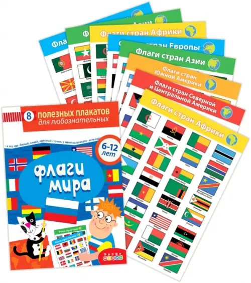 На плакатах представлены флаги стран Европы, Азии, Африки, Северной, Южной и Центральной Америки, Австралии и Океании. Наглядный материал пригодится на уроках окружающего мира, географии и истории. Повесьте плакаты в зоне видимости или положите на стол, где занимается ребёнок, и важная информация всегда будет под рукой.