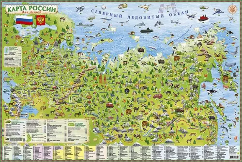 Карта познакомит ребенка с животным и растительным миром России, с различными видами техники и достопримечательностями нашей страны.