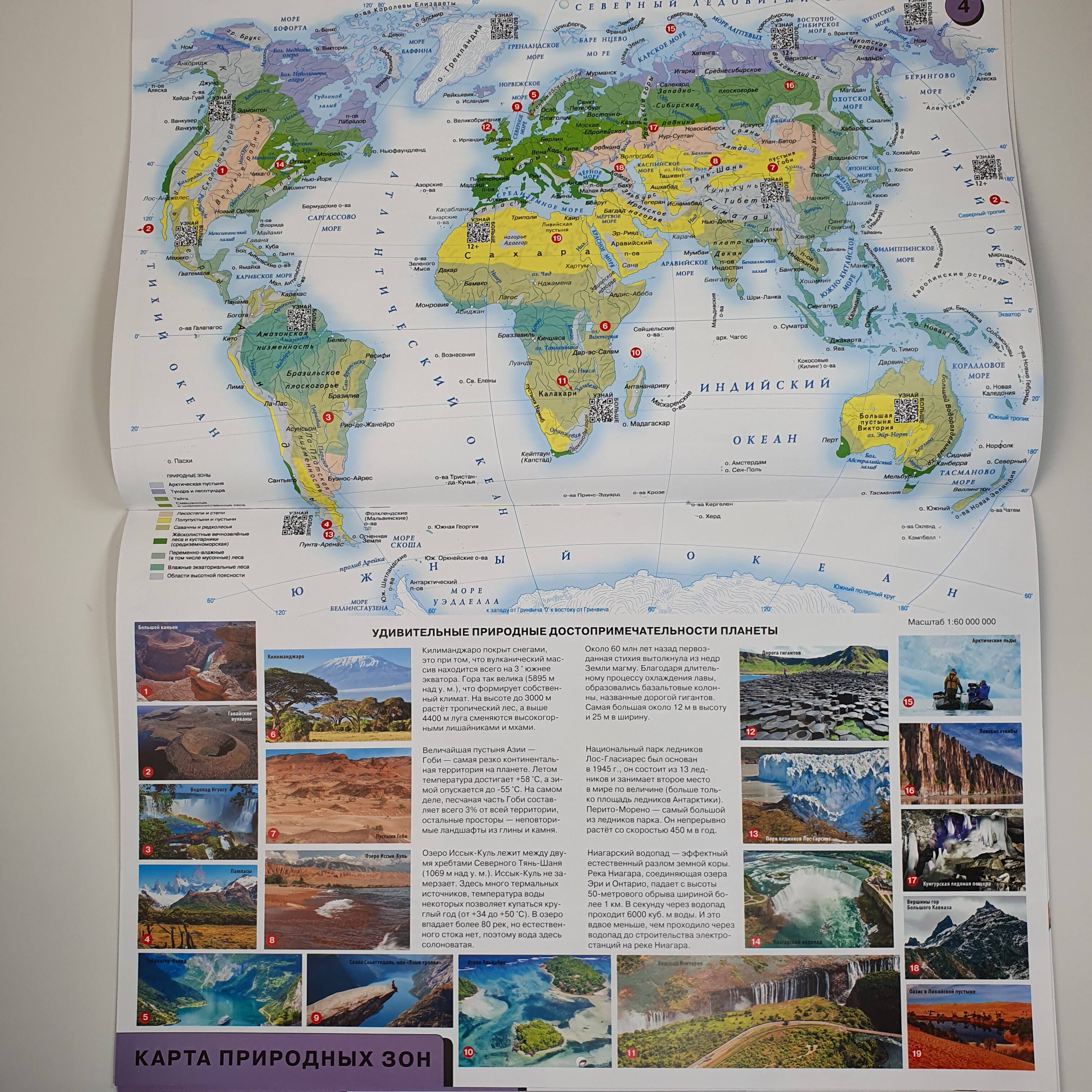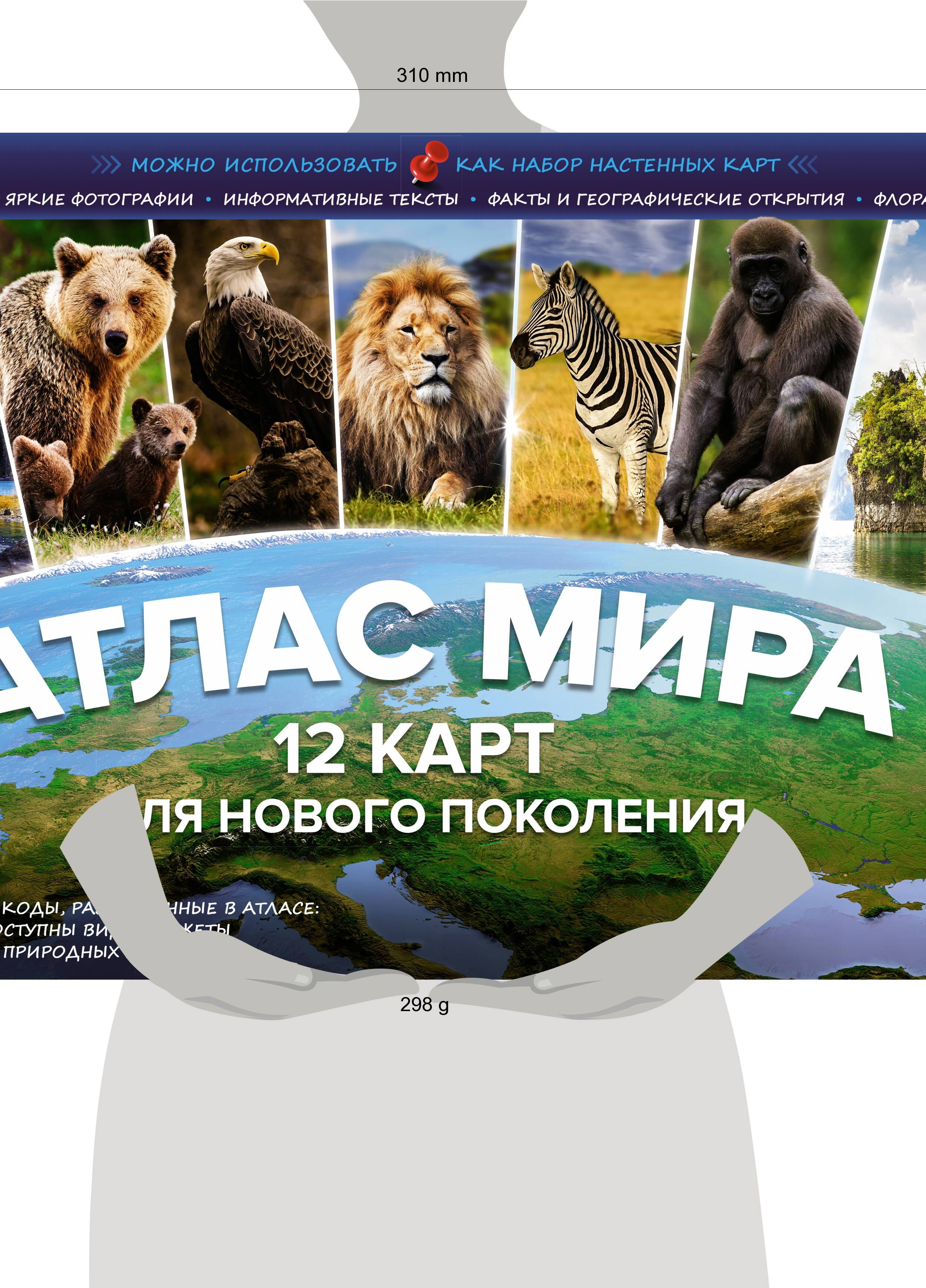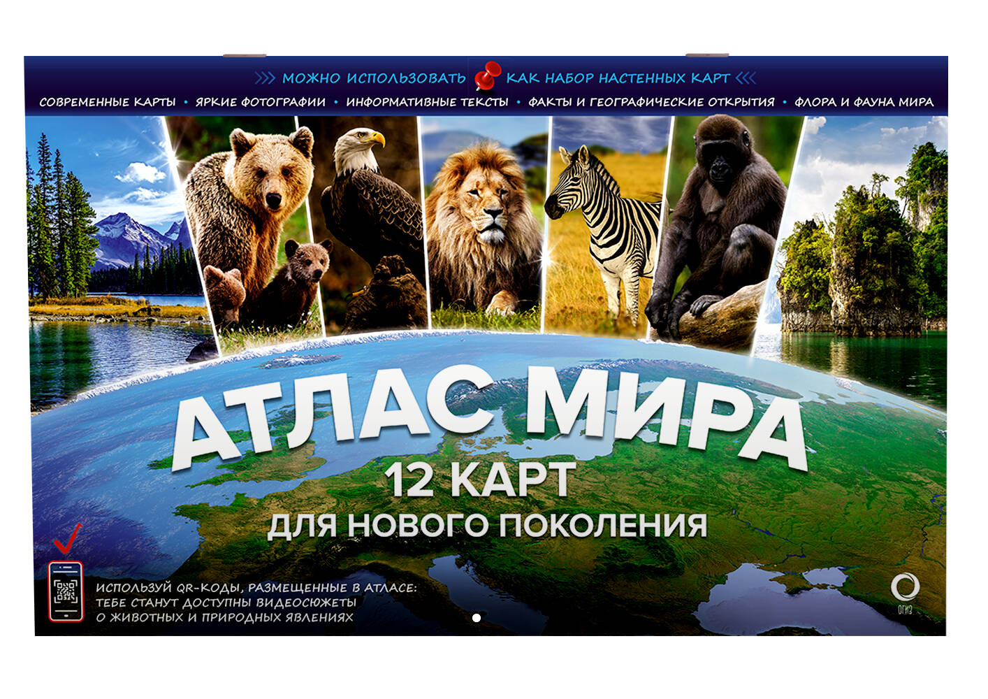 В атласе 12 тематических разворотов - физические и политические карты, а также карты природных зон всех континентов. Карты подготовлены редакцией ОГИЗ, выпускающей картографическую продукцию для детей и взрослых. Рассматривайте вместе с вашим ребенком страницы атласа. Основное содержание - яркие иллюстрации животных, растений, природных достопримечательностей, флаги стран - помогут вам рассказать о том, как устроен наш мир. Придумывайте и совершайте виртуальные путешествия по планете Земля! В нашем атласе размещены QR-коды. С помощью смартфона или планшета можно перейти по ссылке и посмотреть минифильмы о животных и природных явлениях. Дополнительная увлекательная информация в книге поможет вашему ребенку провести время с пользой, расширить кругозор. Атлас можно повесить на стену в виде красочного изменяемого постера размером 47,5х60 см. 12 карт - 12 месяцев - 12 тем. Ваш ребенок, разглядывая карты, запомнит названия материков, океанов, морей и крупных рек, государств и их столиц. С помощью информации, размещенной в атласе, подготовить презентации по окружающему миру и географии станет проще.