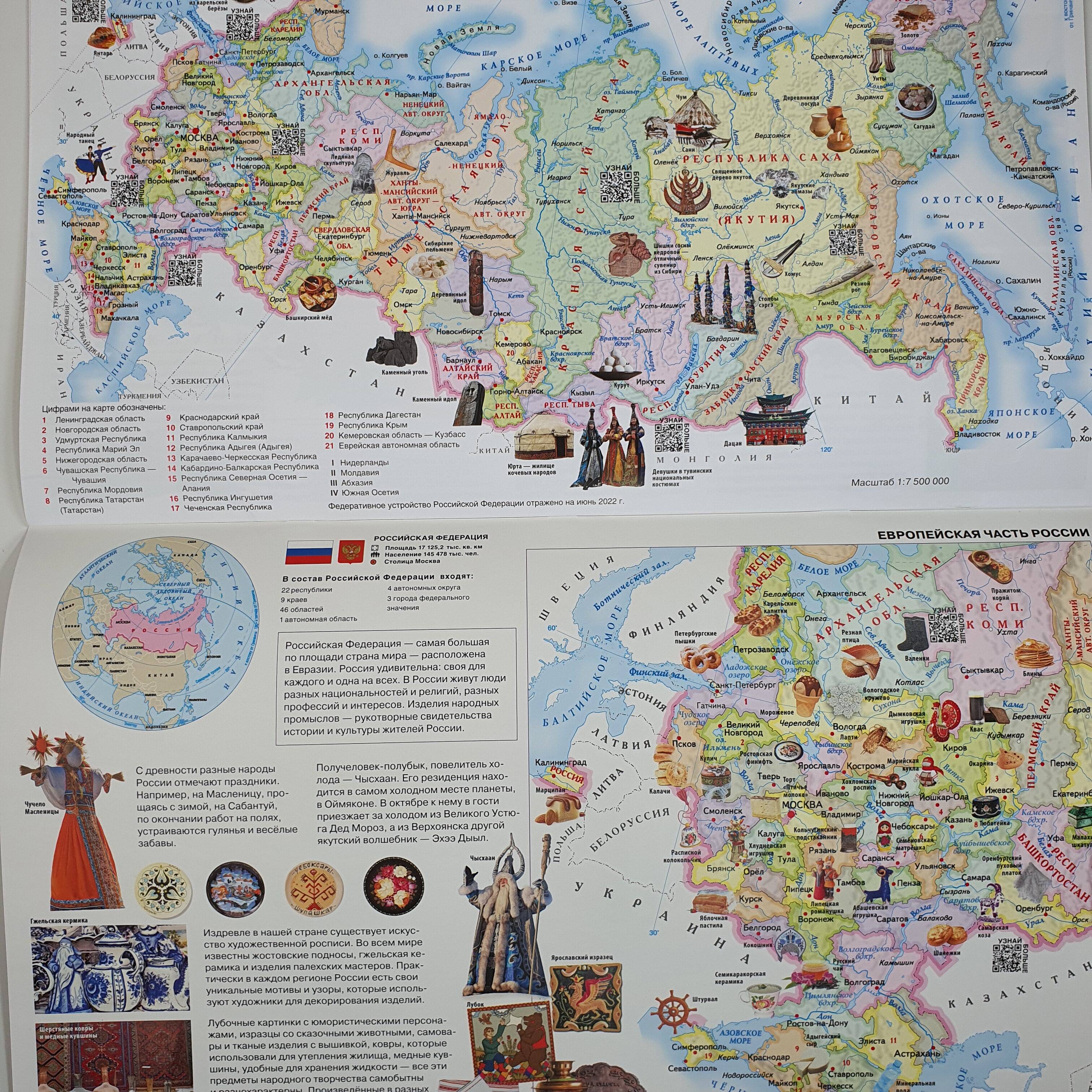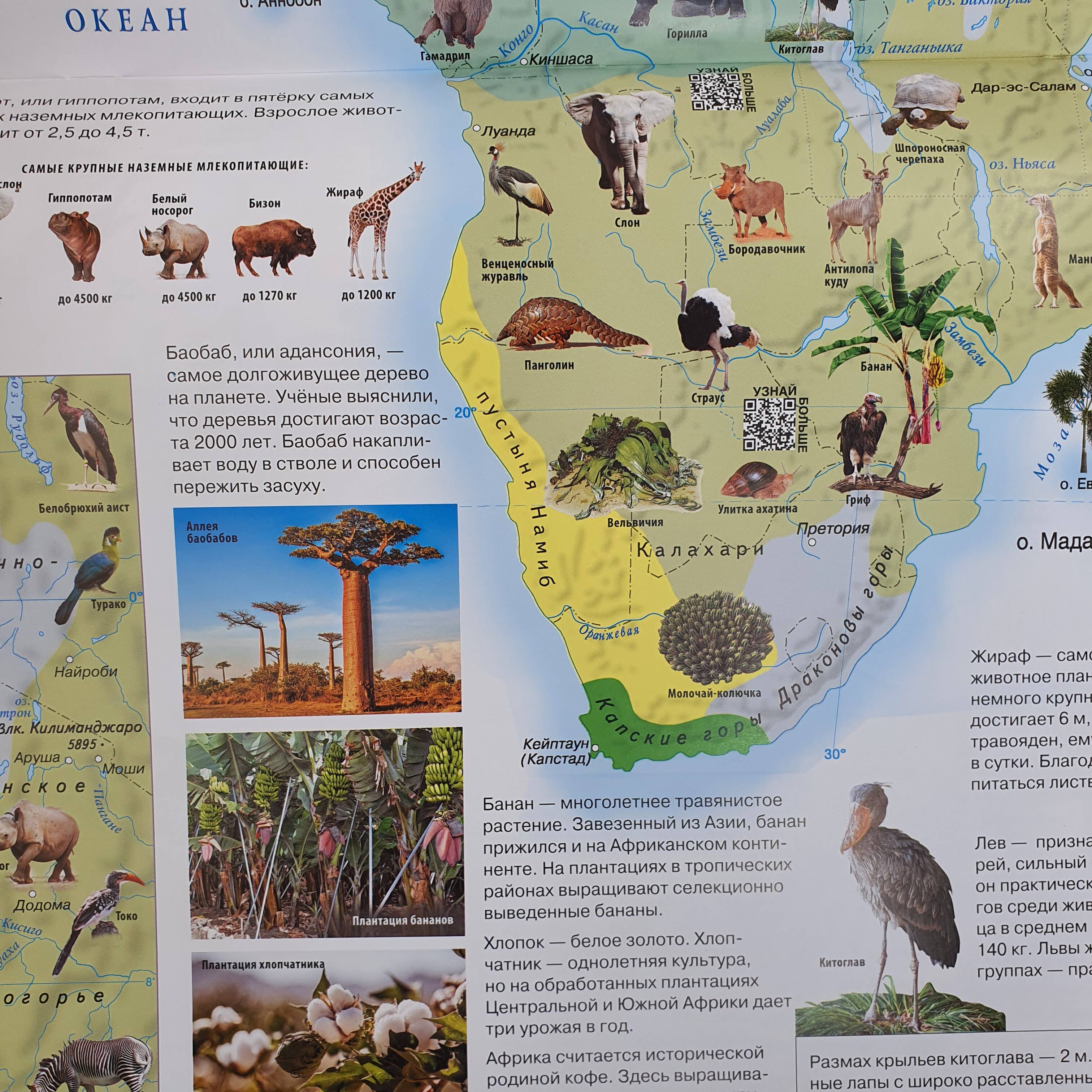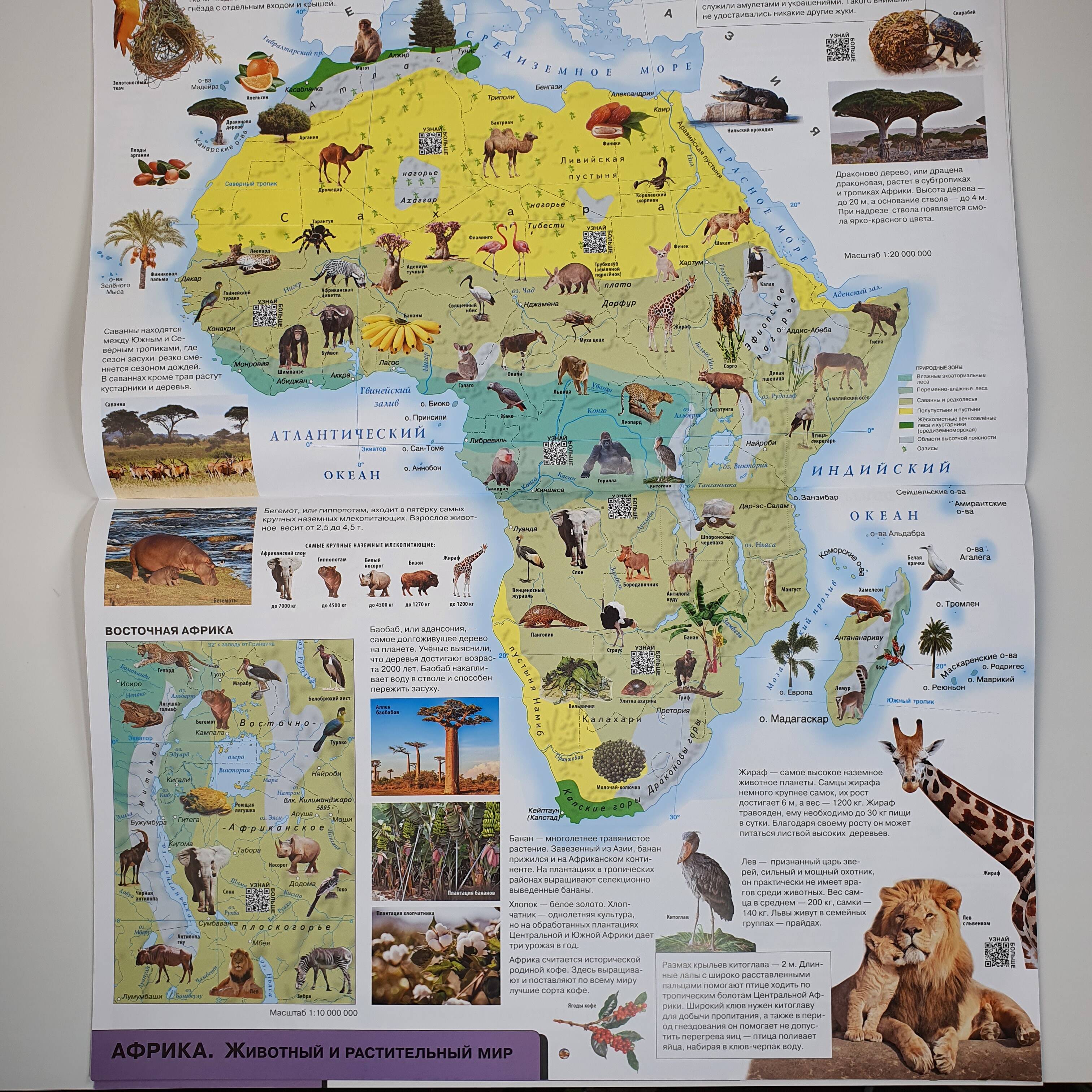В атласе 12 тематических разворотов - физические и политические карты, а также карты природных зон всех континентов. Карты подготовлены редакцией ОГИЗ, выпускающей картографическую продукцию для детей и взрослых. Рассматривайте вместе с вашим ребенком страницы атласа. Основное содержание - яркие иллюстрации животных, растений, природных достопримечательностей, флаги стран - помогут вам рассказать о том, как устроен наш мир. Придумывайте и совершайте виртуальные путешествия по планете Земля! В нашем атласе размещены QR-коды. С помощью смартфона или планшета можно перейти по ссылке и посмотреть минифильмы о животных и природных явлениях. Дополнительная увлекательная информация в книге поможет вашему ребенку провести время с пользой, расширить кругозор. Атлас можно повесить на стену в виде красочного изменяемого постера размером 47,5х60 см. 12 карт - 12 месяцев - 12 тем. Ваш ребенок, разглядывая карты, запомнит названия материков, океанов, морей и крупных рек, государств и их столиц. С помощью информации, размещенной в атласе, подготовить презентации по окружающему миру и географии станет проще.