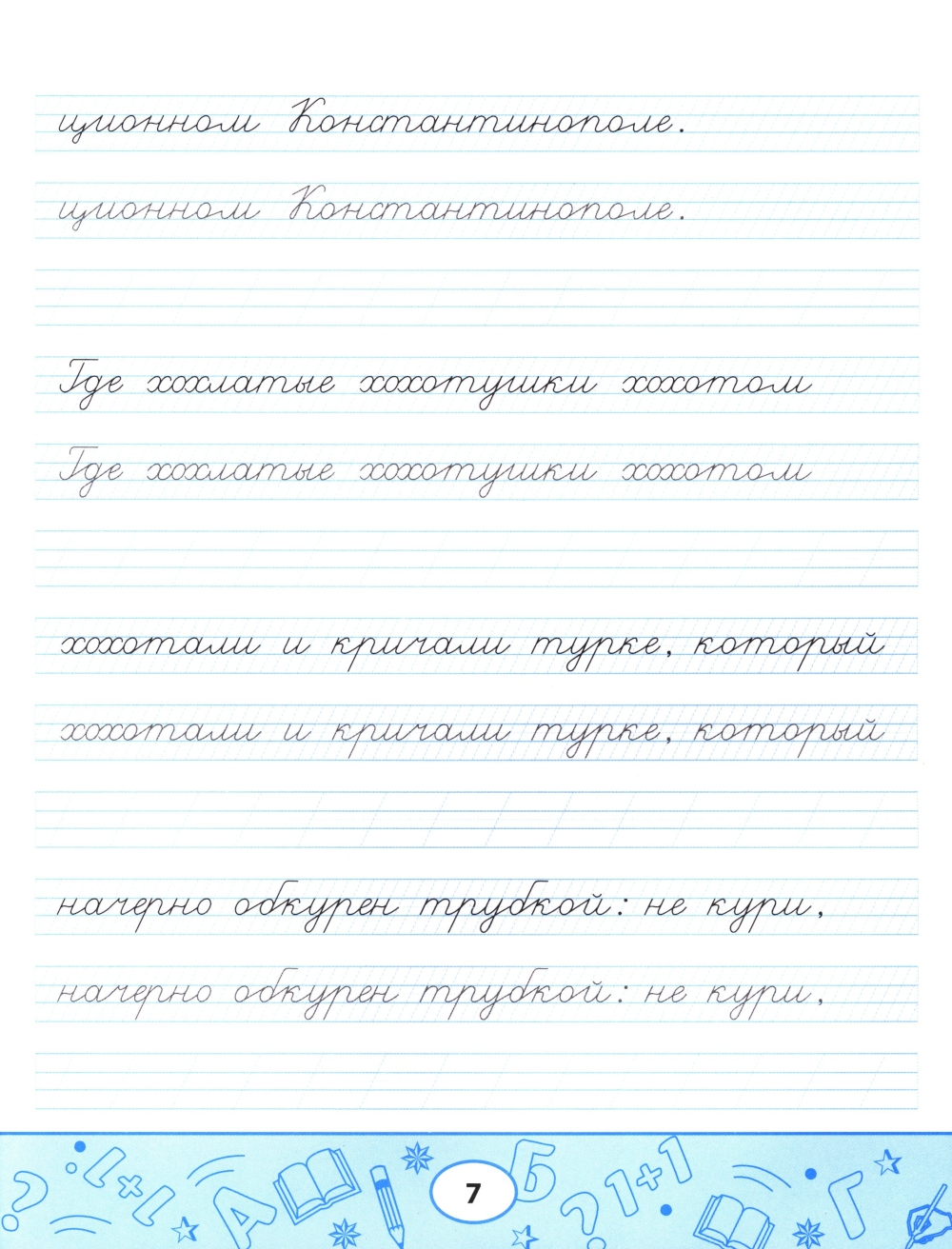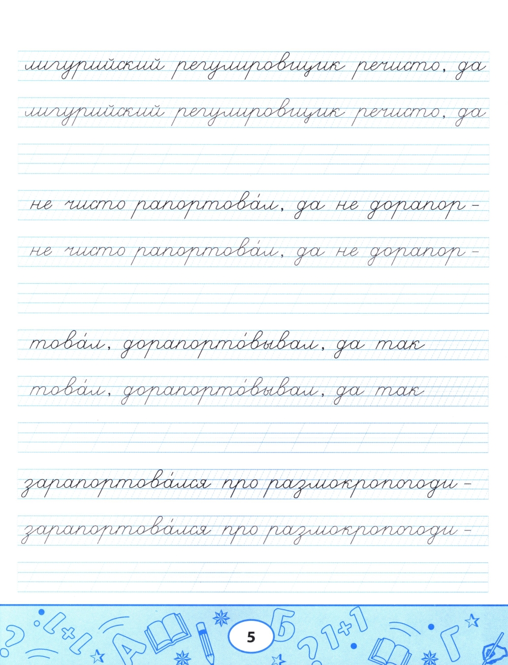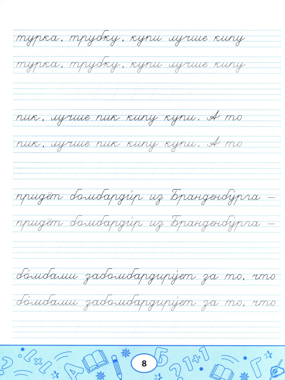 Пропись-скороговорка - комплексный тренажёр, направленный не только на формирование устойчивого почерка, но и на отработку чёткости дикции, развитие памяти, орфографической зоркости и навыков грамотного письма. Пишите аккуратно, проговаривайте вслух скороговорку, рассказывайте её наизусть с выражением: так вы будете не только вырабатывать каллиграфический почерк, но и совершенствовать произношение и активизировать память. Пропись-скороговорка полезна не только школьникам, но и взрослым.