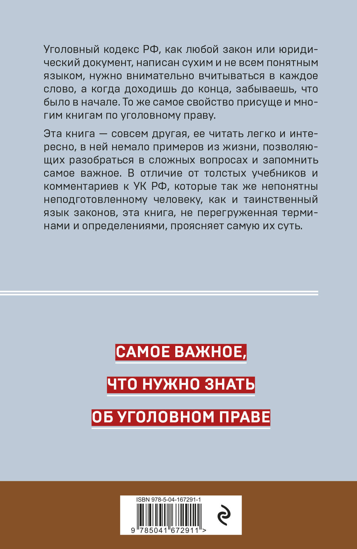 Любой, кто хочет знать свои права и обязанности, сталкивается с проблемой понимания законов и нормативных актов. Юридические документы написаны сложным языком, нужно внимательно вчитываться в каждое слово, а когда доходишь до конца, забываешь, что было в начале. Эта книга - совсем другая, она написана легко и интересно, в ней немало примеров из жизни, позволяющих разобраться в сложных вопросах и запомнить самое важное. Книга поможет вам: - понять значение базовых терминов уголовного права - состав преступления, презумпция невиновности, соучастие, уголовная ответственность и уголовное наказание и т.д.; - научиться правильно читать Уголовный кодекс; - и, в конечном итоге - научиться понимать Уголовный кодекс О чем эта книга Автор в популярной форме, простым языком объясняет сложные вопросы и дает комментарии к нормам Уголовного кодекса. Для кого эта книга: Для тех, кто желает обогатить свой кругозор общеправовыми знаниями. необходимыми для личностного развития и правовой самозащиты. Для студентов, аспирантов, преподавателей, а также для тех, кто работает или только готовится к работе в правоохранительных органах и нуждается в получении актуальной и достоверной информации. Об авторе: Дмитрий Усольцев - автор книг по правовой поддержке граждан. Его произведения выдержали десятки переизданий, поэтому он точно знает, как заинтересовать читателя юридическими вопросами и рассказать о сложных вещах просто и понятно.| Издательство | ООО "Издательство "Эксмо" |