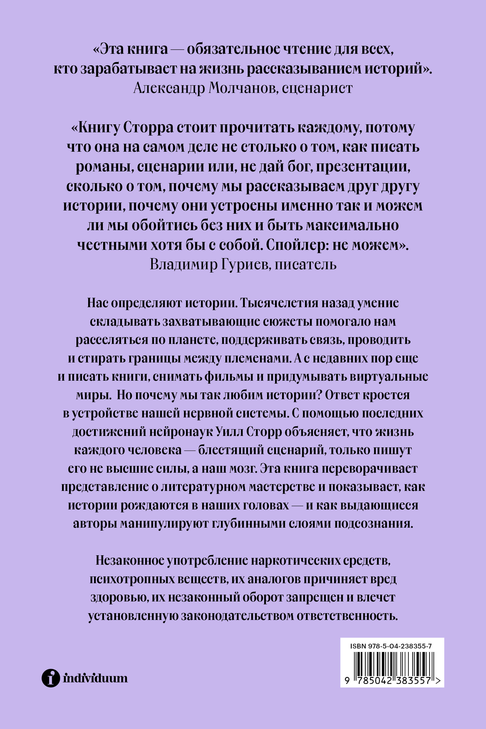 НЕЗАКОННОЕ ПОТРЕБЛЕНИЕ НАРКОТИЧЕСКИХ СРЕДСТВ, ПСИХОТРОПНЫХ ВЕЩЕСТВ, ИХ АНАЛОГОВ ПРИЧИНЯЕТ ВРЕД ЗДОРОВЬЮ, ИХ НЕЗАКОННЫЙ ОБОРОТ ЗАПРЕЩЕН И ВЛЕЧЕТ УСТАНОВЛЕННУЮ ЗАКОНОДАТЕЛЬСТВОМ ОТВЕТСТВЕННОСТЬ. Нас определяют истории. Они лежат в основе наших убеждений и верований, характеров и вкусов. Тысячелетия назад умение складывать захватывающие сюжеты помогало нам расселяться по планете, поддерживать связь, проводить и стирать границы между племенами. А с недавних пор еще и писать книги, снимать фильмы и придумывать виртуальные миры. Но почему мы так любим истории? Ответ кроется в устройстве нашего мозга. С помощью последних достижений нейронаук Уилл Сторр объясняет, что корни всемирной славы Шекспира лежат в эволюции, в чем сила "Гражданина Кейна" и "Красоты по-американски" и чему мы можем научиться у самих себя. По мнению Сторра, жизнь каждого человека - блестящий сценарий, только пишут его не высшие силы, а наш мозг, ежеминутно наполняя происходящее смыслом и предназначением. "Внутренний рассказчик" переворачивает представление о литературном мастерстве и навыках сценариста и показывает, как истории рождаются в наших головах - и как авторы киноблокбастеров и признанных литературных шедевров манипулируют глубинными слоями подсознания. Осторожно: спойлеры! В книге раскрывается сюжет "Короля Лира", "Гамлета", "Дороги перемен", "Лолиты", "Лоуренса Аравийского" и др.| Издательство | ООО "Издательство "Эксмо" |