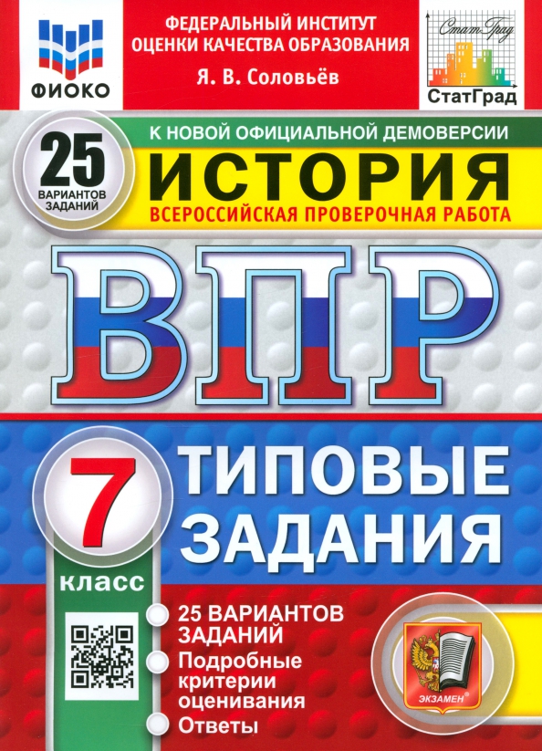 Данное пособие полностью соответствует федеральному государственному образовательному стандарту. Книга содержит 25 вариантов типовых заданий Всероссийской проверочной работы (ВПР) по истории для учащихся 7-х классов. Сборник предназначен учащимся 7-х классов, учителям и методистам, использующим типовые задания для подготовки к Всероссийской проверочной работе по истории. Я. В. Соловьёв - кандидат исторических наук, доцент кафедры истории России Государственного университета просвещения, старший научный сотрудник Научно-просветительского отдела Государственной публичной исторической библиотеки России, автор пособий по истории России, ЕГЭ, ОГЭ и ВПР.