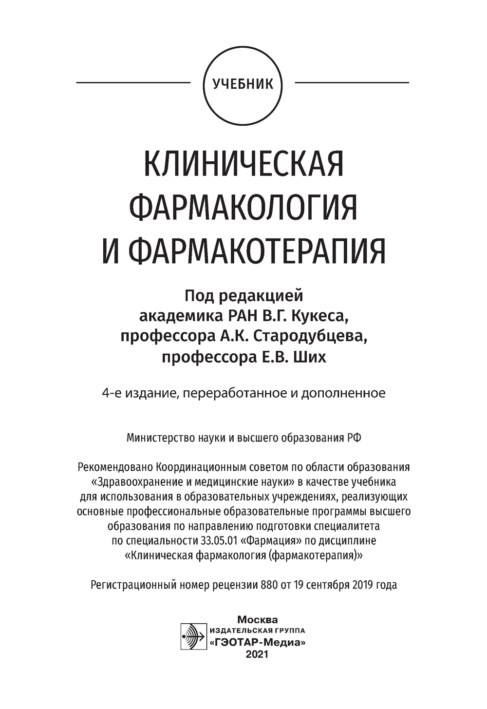 Аннотация: Клиническая фармакология и фармакотерапия: Учебник. 4-е изд., перераб.и доп