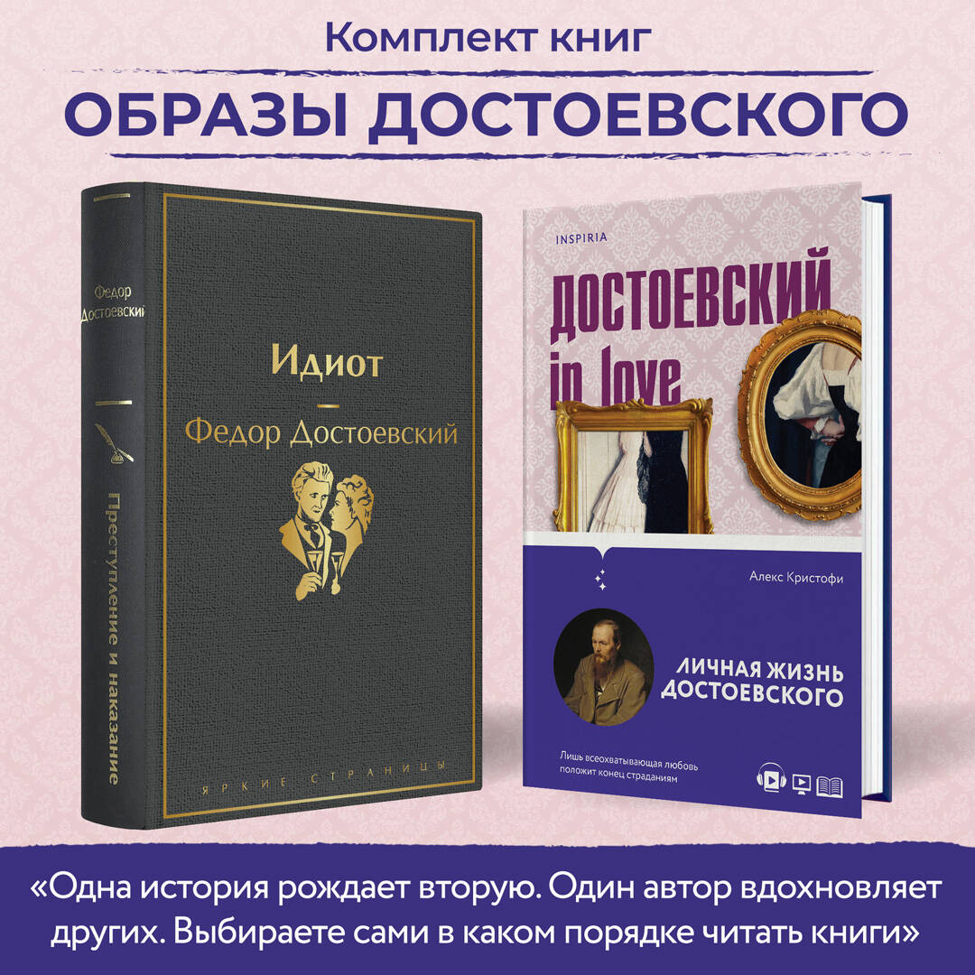 Комплект из двух книг: «Идиот» Ф.М. Достоевского и «Достоевский in love» А. Кристофи. Одна история рождает вторую. Один автор вдохновляет других. Не важно, в каком порядке читать книги. Можно начать с романа «Идиот», а можно с «Достоевский in love» Алекса Кристофи, и посмотреть на культовый роман «Идиот» другими глазами. В «Достоевский in love» сплетены отрывки из произведений Федора Михайловича и исторический контекст. В результате получился роман, который погружает читателя в грандиозную перспективу мира Достоевского: от сибирского лагеря до игорных залов Европы, от сырых тюремных камер царской крепости до изысканных салонов Санкт-Петербурга. Также Кристофи рассказал истории трех женщин, чьи жизни были так тесно переплетены с жизнью писателя: чахоточной вдовы Марии, порывистой Полины, имевшей видения об убийстве царя, и верной стенографистки Анны, которая так много сделала для сохранения его литературного наследия. Кристофи создал мемуары, которые мог бы написать Достоевский, если бы не вмешались жизнь и литературная слава. Он дает новый портрет художника, который, возможно, был нам раньше незнаком: застенчивый, но преданный любящий, чуткий друг народа, верный брат и друг, а также писатель, способный проникнуть в глубины человеческой души.