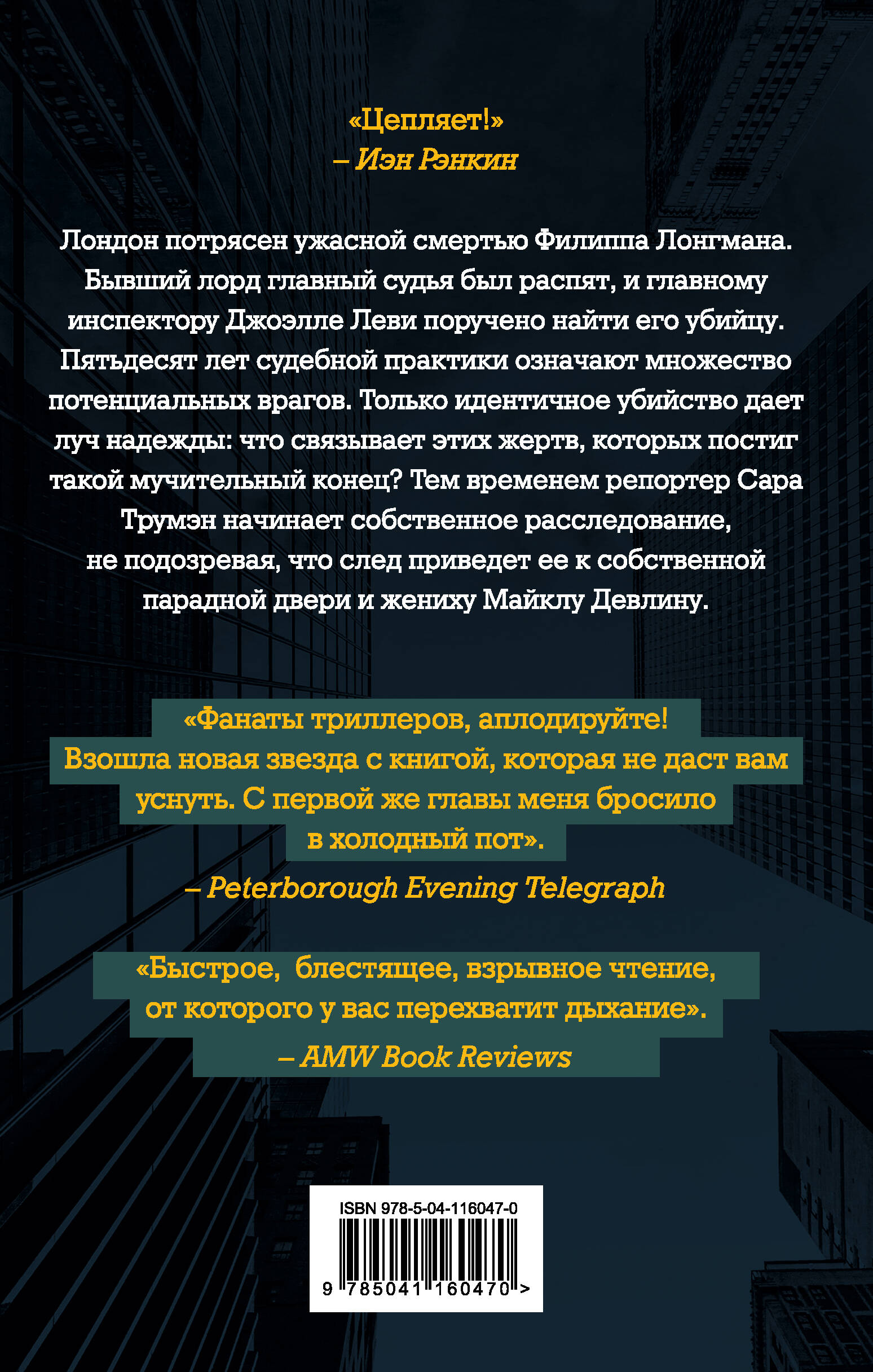 Лондон потрясен ужасной смертью Филиппа Лонгмана. Бывший лорд главный судья был распят, и главному инспектору Джоэлле Леви поручено найти его убийцу. Пятьдесят лет судебной практики означает множество потенциальных врагов. Только идентичное убийство дает луч надежды: что связывает этих жертв, которых постиг такой мучительный конец? Тем временем репортер Сара Трумэн начинает собственное расследование, не подозревая, что след приведет ее к собственной парадной двери и жениху Майклу Девлину. Тони Кент написал блестящую серию политических триллеров, которая заведет читателя в извилистый лабиринт подковерных заговоров, уловок правительства и секретных служб: то, что нужно для фанатов историй в духе «Карточного домика».| Издательство | ООО "Издательство "Эксмо" |