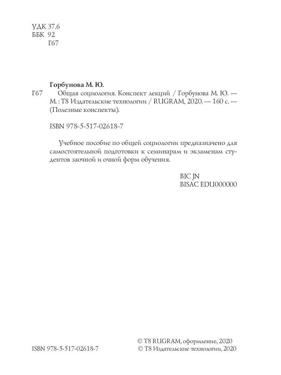 Учебное пособие по общей социологии предназначено для самостоятельной подготовки к семинарам и экзаменам студентов заочной и очной форм обучения.| Издательство | Т8 RUGRAM |