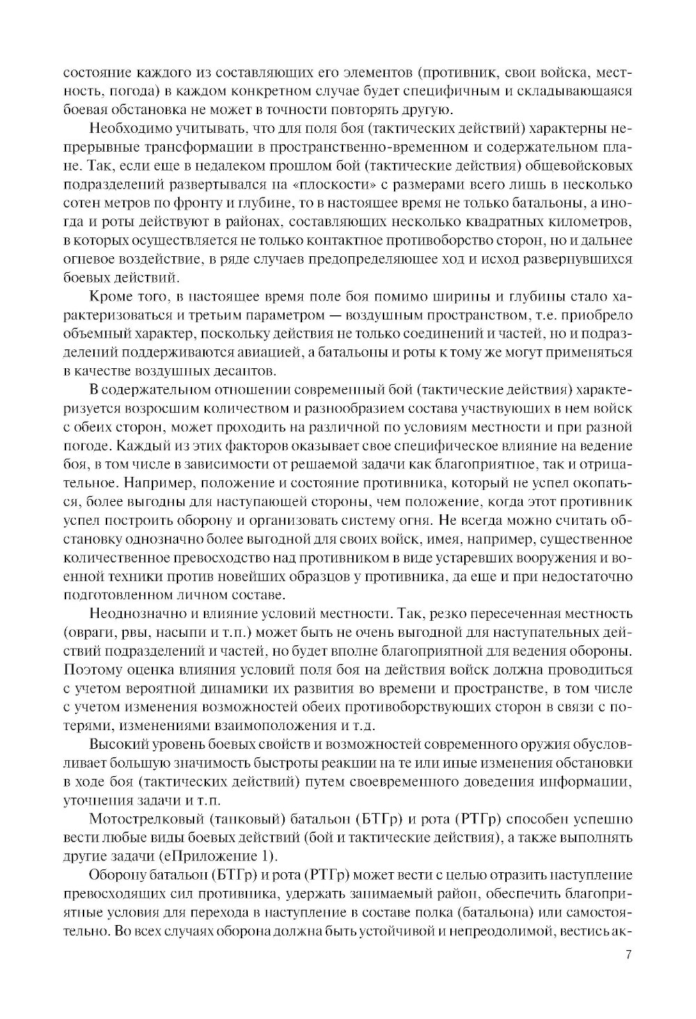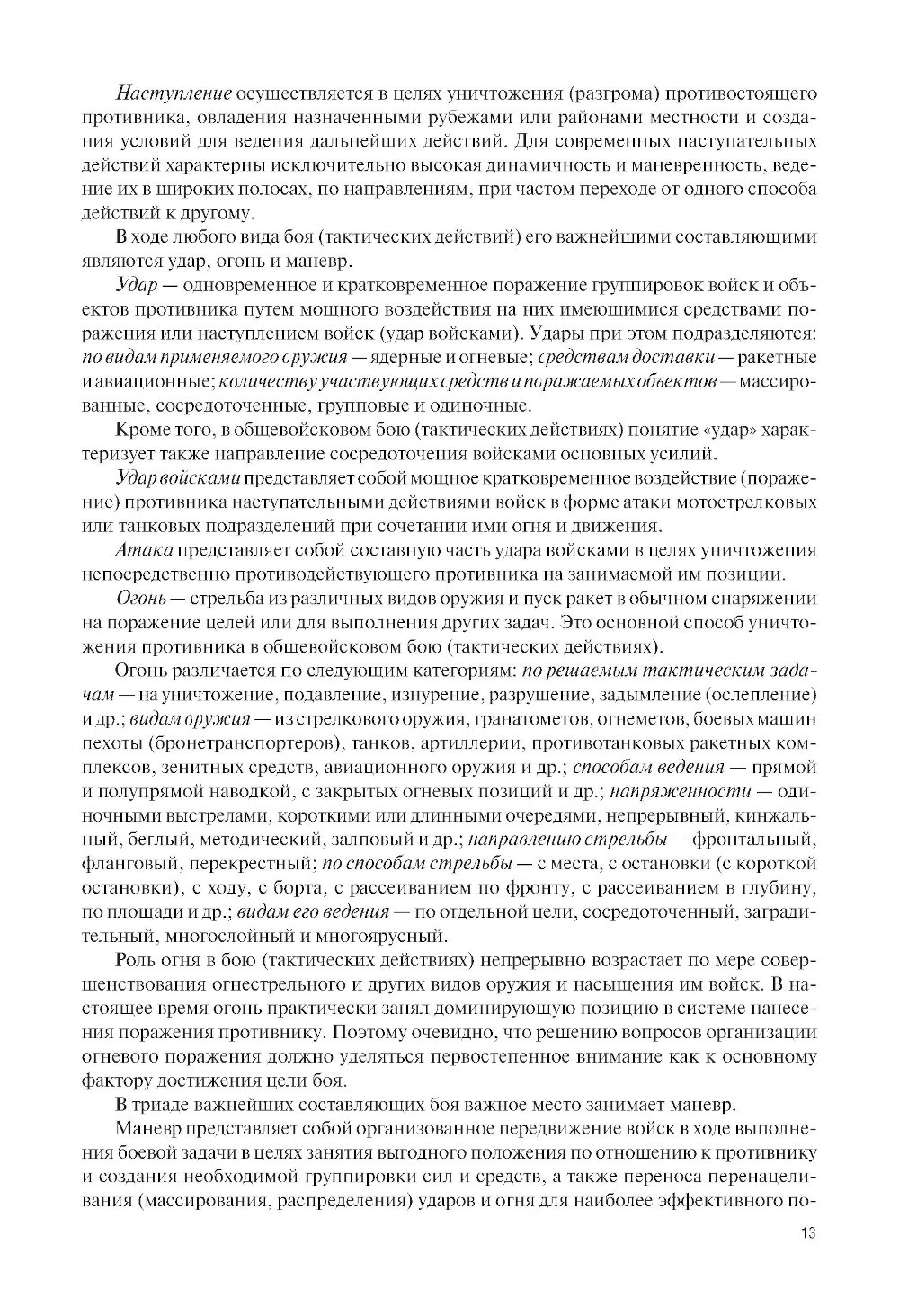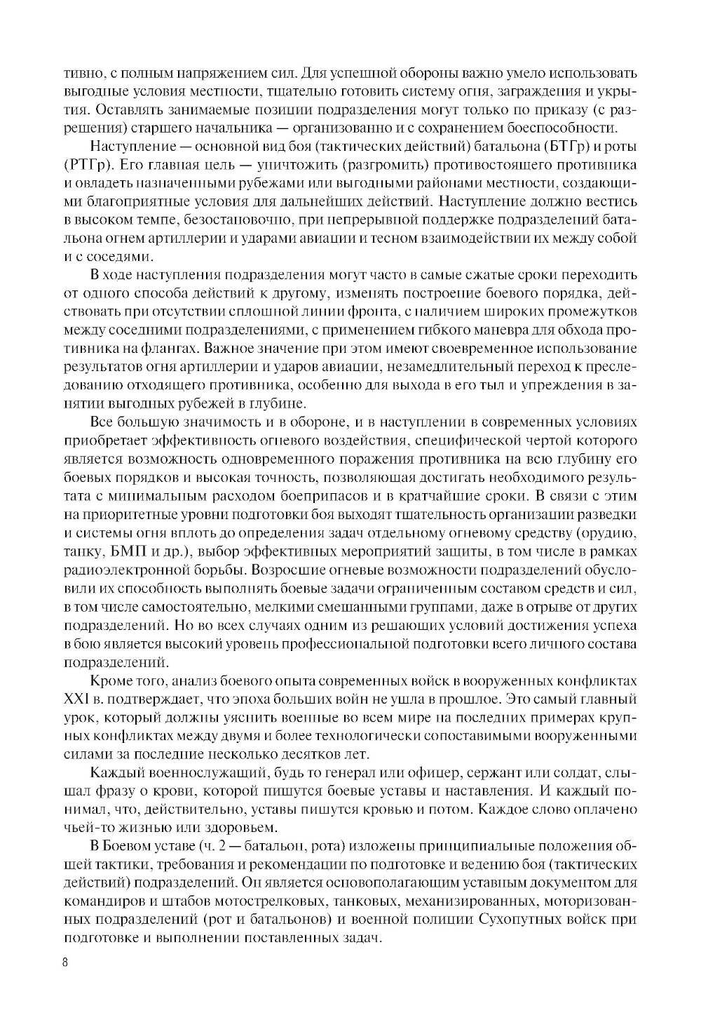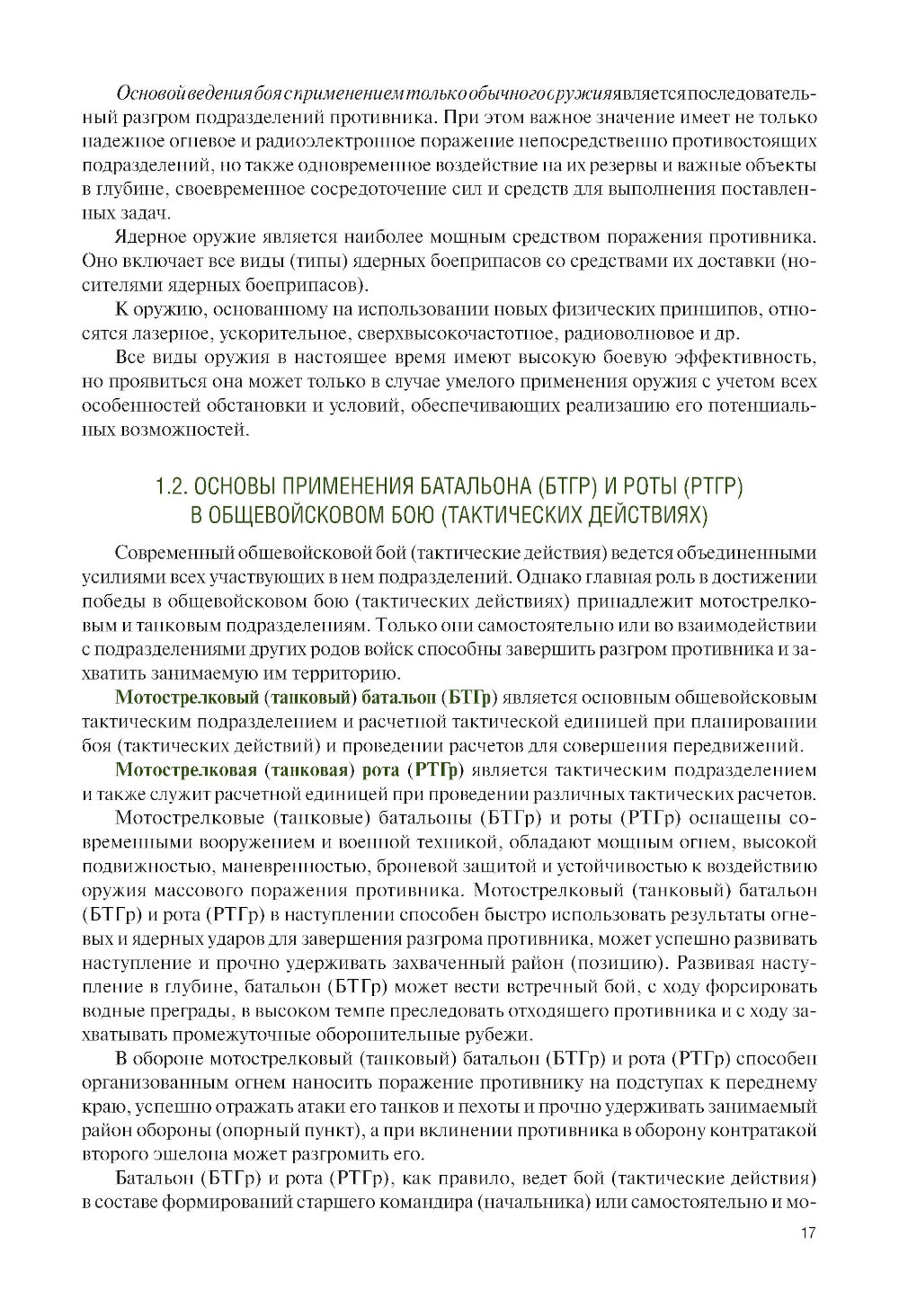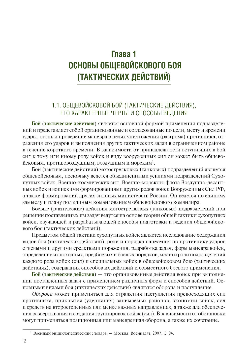 Излагаются основные положения по подготовке и ведению общевойскового боя мотострелковыми, танковыми и пулеметно-артиллерийскими батальонами и ротами во взаимодействии с подразделениями других родов войск Вооруженных Сил РФ. Основное внимание уделяется подготовке и ведению боевых действий с применением только обычного оружия. Разработан на основе положений Боевого устава по подготовке и ведению общевойскового боя с соответствующей их детализацией и использованием конкретных примеров, в том числе из опыта боевых действий в Великой Отечественной войне и вооруженных конфликтах, произошедших в послевоенное время. Для студентов, проходящих обучение на военных кафедрах вузов, курсантов и слушателей высших военно-учебных заведений, а также офицеров тактического звена Сухопутных войск.