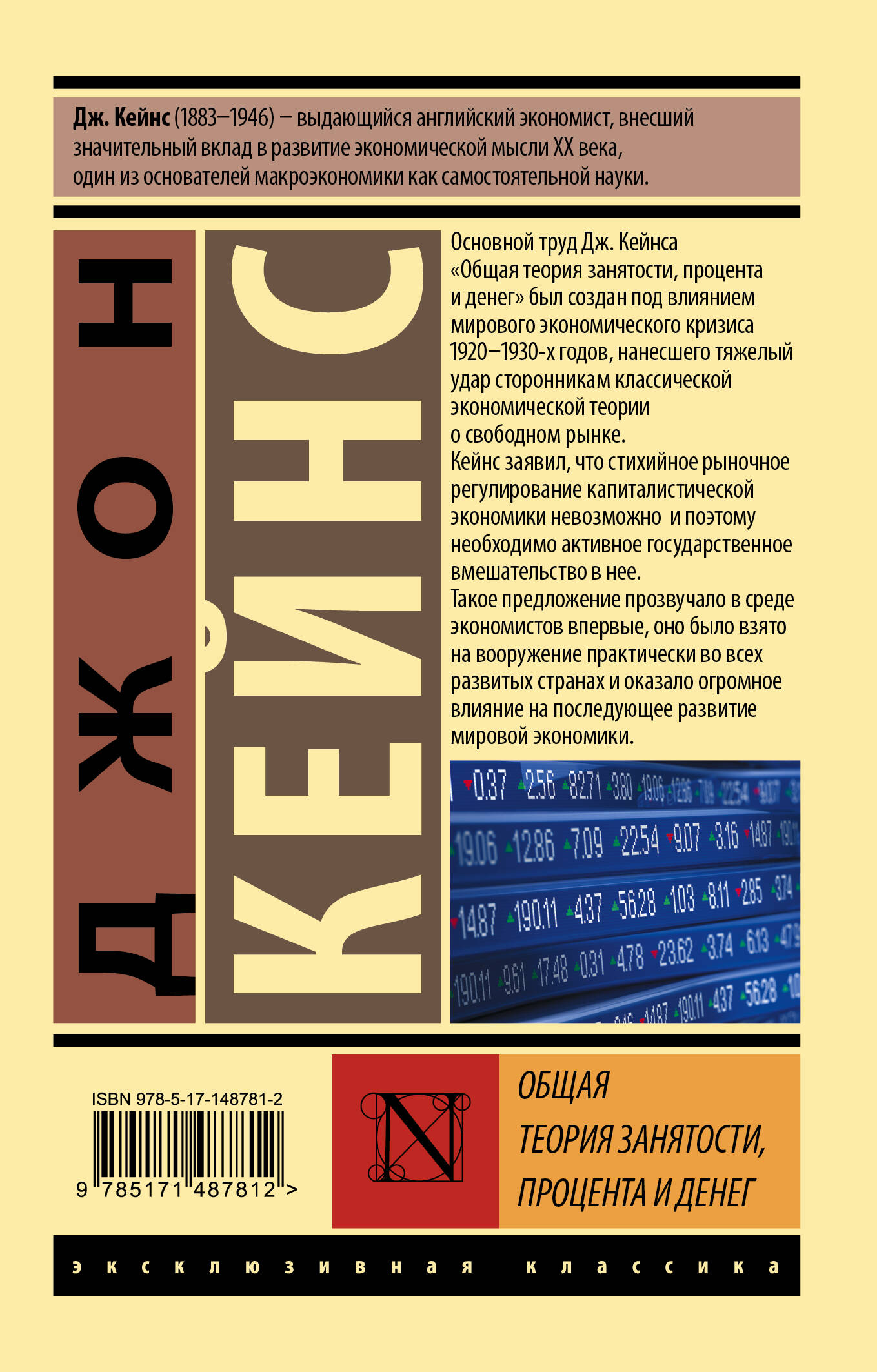 Дж. Кейнс (1883-1946) - выдающийся английский экономист, внесший значительный вклад в развитие экономической мысли ХХ века, один из основателей макроэкономики как самостоятельной науки. Основной труд Дж. Кейнса "Общая теория занятости, процента и денег" был создан под влиянием мирового экономического кризиса 1920-1930-х годов, нанесшего тяжелый удар сторонникам классической экономической теории о свободном рынке. Кейнс заявил, что стихийное рыночное регулирование капиталистической экономики невозможно и поэтому необходимо активное государственное вмешательство в нее. Такое предложение прозвучало в среде экономистов впервые, оно было взято на вооружение практически во всех развитых странах и оказало огромное влияние на последующее развитие мировой экономики.| Издательство | АСТ |