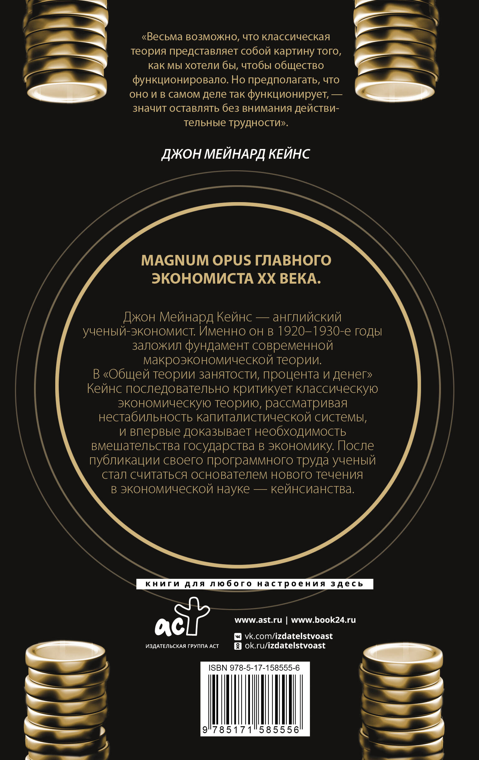 Джон Мейнард Кейнс - английский ученый-экономист. Именно он в 1920-1930-е годы заложил фундамент современной макроэкономической теории. В "Общей теории занятости, процента и денег" Кейнс последовательно критикует классическую экономическую теорию, рассматривая нестабильность капиталистической системы, и впервые доказывает необходимость вмешательства государства в экономику. После публикации своего программного труда ученый стал считаться основателем нового течения в экономической науке - кейнсианства. "Весьма возможно, что классическая теория представляет собой картину того, как мы хотели бы, чтобы общество функционировало. Но предполагать, что оно и в самом деле так функционирует, - значит оставлять без внимания действительные трудности". - Джон Мейнард Кейнс| Издательство | Издательство "АСТ" |