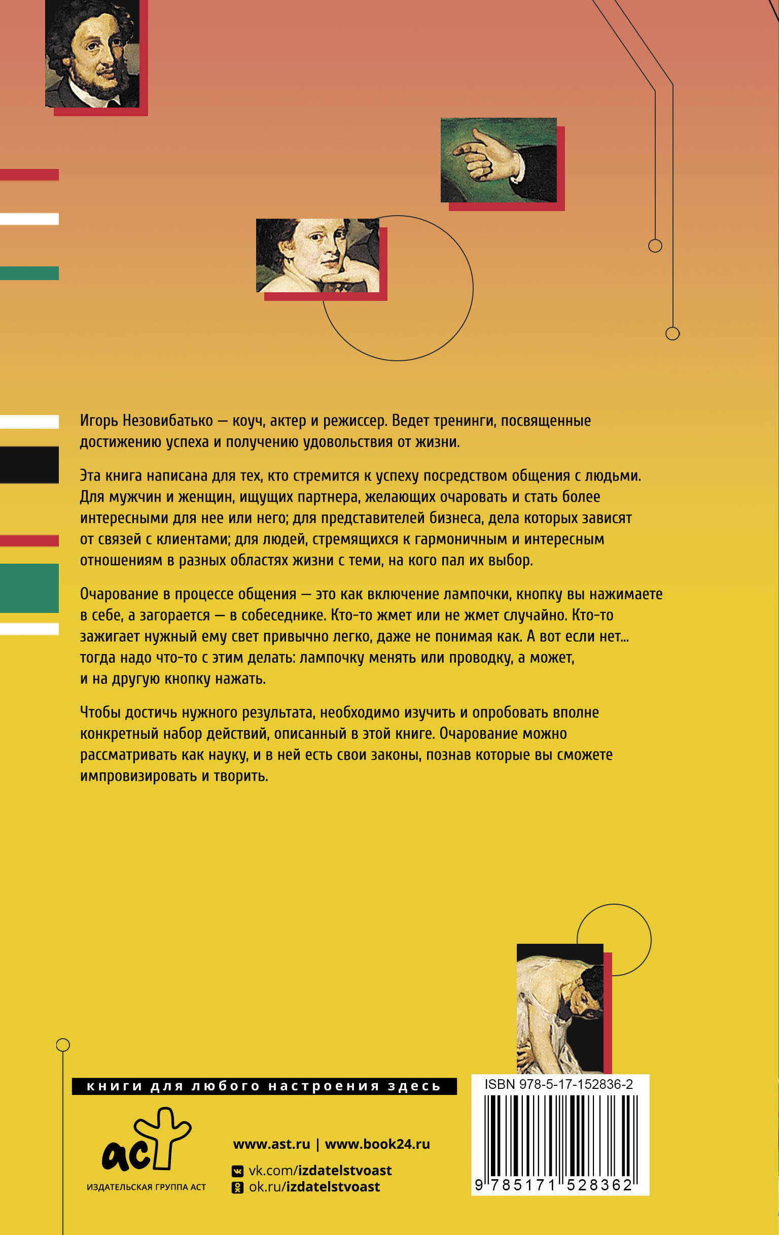 Игорь Незовибатько - коуч, актер и режиссер. Ведет тренинги, посвященные достижению успеха и получению удовольствия от жизни. Эта книга написана для тех, кто стремится к успеху посредством общения с людьми. Для мужчин и женщин, ищущих партнёра, желающих очаровать и стать более интересными для неё или него; для представителей бизнеса, дела которых зависят от связей с клиентами; для людей, стремящихся к гармоничным и интересным отношениям в разных областях жизни с теми, на кого пал их выбор. Очарование в процессе общения - это как включение лампочки, кнопку вы нажимаете в себе, а загорается - в собеседнике. Кто-то жмёт или не жмёт случайно. Кто-то зажигает нужный ему свет привычно легко, даже не понимая как. А вот если нет… тогда надо что-то с этим делать: лампочку менять или проводку, а может, и на другую кнопку нажать. Чтобы достичь нужного результата, необходимо изучить и опробовать вполне конкретный набор действий, описанный в этой книге. Очарование можно рассматривать как науку, и в ней есть свои законы, познав которые вы сможете импровизировать и творить.| Издательство | ИЗДАТЕЛЬСТВО "АСТ" |