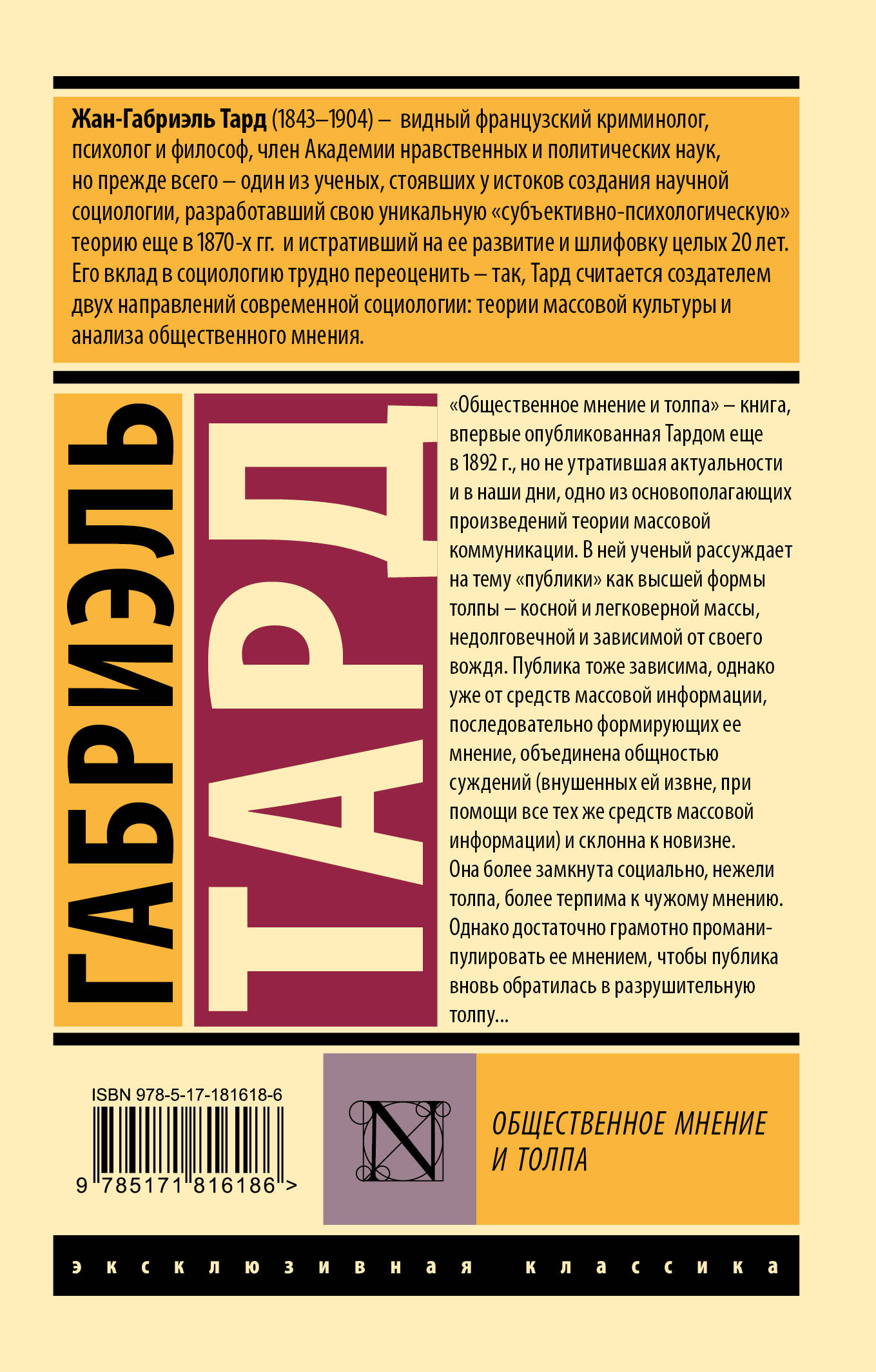 Жан-Габриэль Тард (1843 - 1904) - видный французский криминолог, психолог и философ, член Академии нравственных и политических наук, но прежде всего - один из ученых, стоявших у истоков создания научной социологии, разработавший свою уникальную "субъективно-психологическую" теорию еще в 1870-х гг. и истративший на ее развитие и шлифовку целых 20 лет. Его вклад в социологию трудно переоценить - так, Тард считается создателем двух направлений современной социологии: теории массовой культуры и анализа общественного мнения. "Общественное мнение и толпа" - книга, впервые опубликованная Тардом еще в 1892 г., но не утратившая актуальности и в наши дни, одно из основополагающих произведений теории массовой коммуникации. В ней ученый рассуждает на тему "публики" как высшей формы толпы - косной и легковерной массы, недолговечной и зависимой от своего вождя. Публика тоже зависима, однако уже от средств массовой информации, последовательно формирующих ее мнение, объединена общностью суждений (внушенных ей извне, при помощи все тех же средств массовой информации) и склонна к новизне. Она более замкнута социально, нежели толпа, более терпима к чужому мнению. Однако достаточно грамотно проманипулировать ее мнением, чтобы публика вновь обратилась в разрушительную толпу...| Издательство | Издательство "АСТ" |