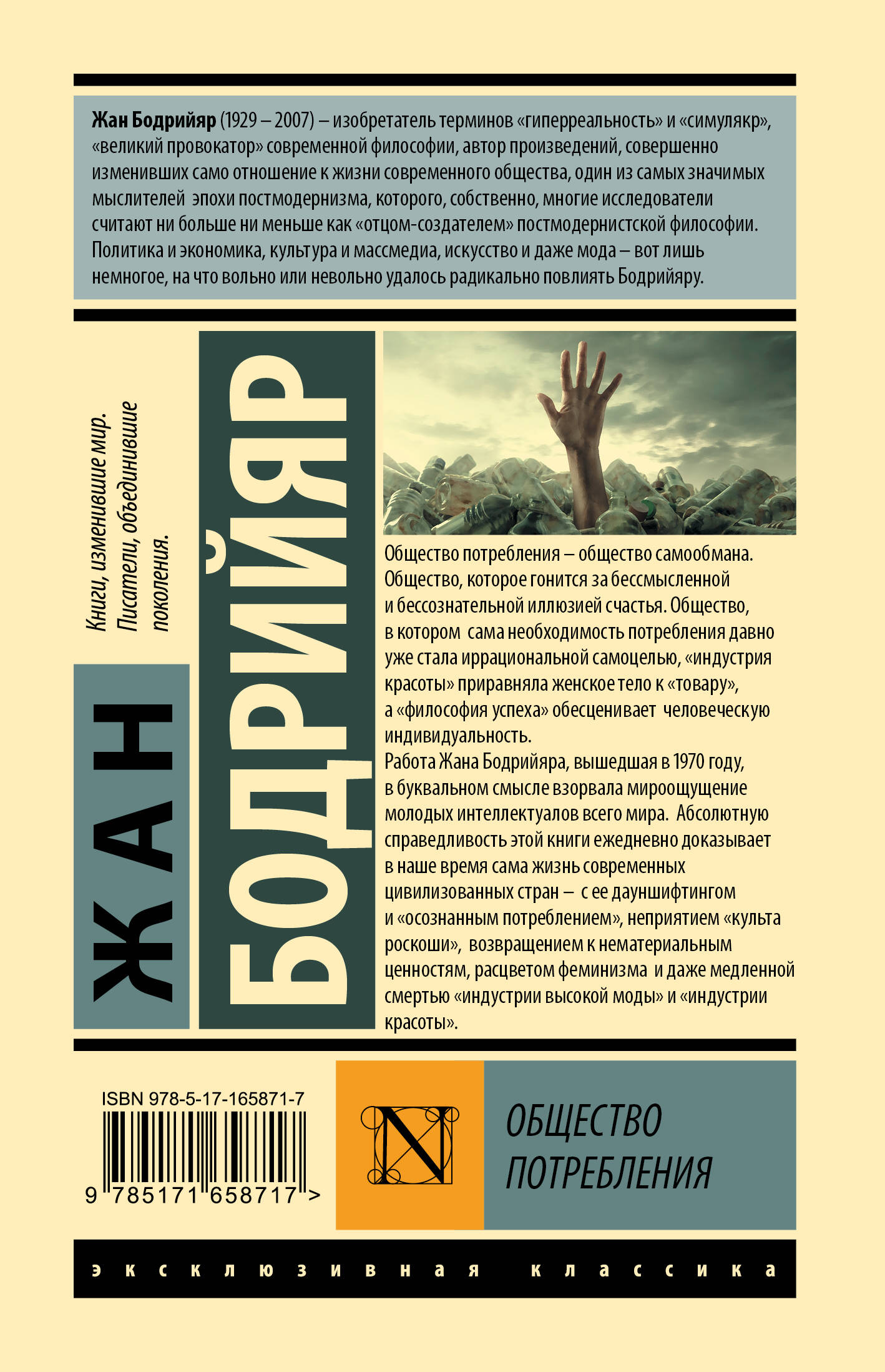 Жан Бодрийяр (1929 - 2007) - изобретатель терминов "гиперреальность" и "симулякр", "великий провокатор" современной философии, автор произведений, совершенно изменивших само отношение к жизни современного общества, один из самых значимых мыслителей эпохи постмодернизма, которого, собственно, многие исследователи считают ни более ни менее как "отцом-создателем" постмодернистской философии. Политика и экономика, культура и масс-медиа, искусство и даже мода - вот лишь немногое, на что, вольно или невольно, удалось радикально повлиять Бодрийяру. Общество потребления - общество самообмана. Общество, которое гонится за бессмысленной и бессознательной иллюзией счастья. Общество, в котором сама необходимость потребления давно уже стала иррациональной самоцелью, "индустрия красоты" приравняла женское тело к "товару", а "философия успеха" обесценивает человеческую индивидуальность. Работа Жана Бодрийяра, вышедшая в 1970 году, в буквальном смысле взорвала мироощущение молодых интеллектуалов всего мира. Абсолютную справедливость этой книги ежедневно доказывает в наше время сама жизнь современных цивилизованных стран - с ее дауншифтингом и "осознанным потреблением", неприятием "культа роскоши", возвращением к нематериальным ценностям, расцветом феминизма и даже медленной смертью "индустрии высокой моды" и "индустрии красоты".| Издательство | Издательство "АСТ" |