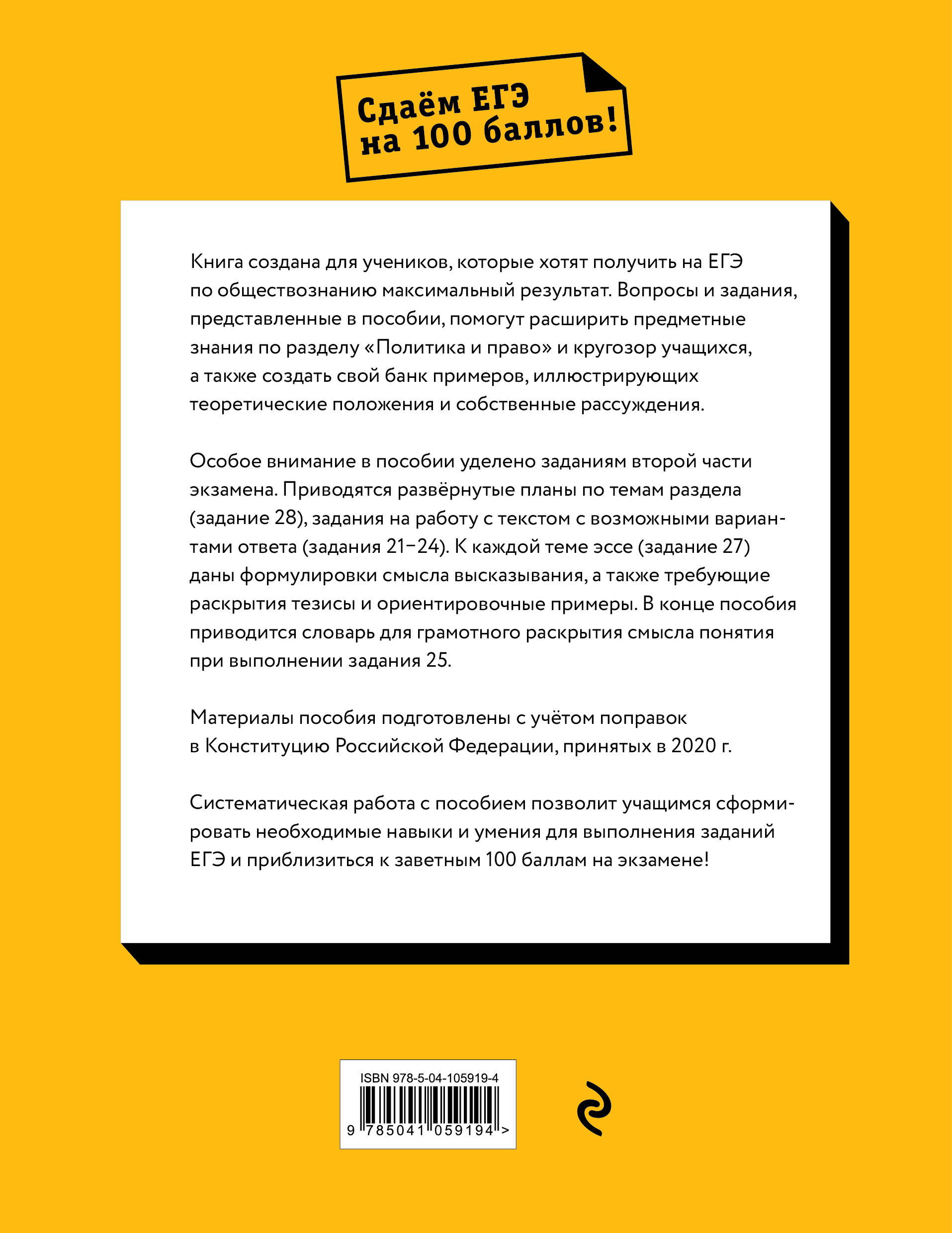 В книгах серии «Сдаем ЕГЭ на 100 баллов» особое внимание уделено самым сложным темам и заданиям экзамена, требующим глубокого знания теории. Настоящее пособие посвящено разделу обществознания «Политика и право». Это не традиционный задачник, ориентированный только на тренировку выполнения различных упражнений. Тексты, задания, вопросы подобраны таким образом, чтобы работа с ними расширяла предметные знания, а также накапливались примеры, иллюстрирующие теоретические положения, формировался широкий спектр умений.| Издательство | ООО "Издательство "Эксмо" |