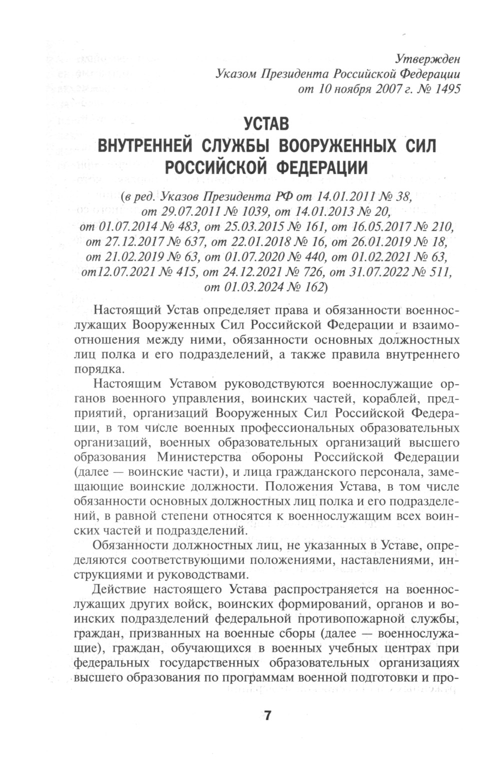 В книге приведены полные тексты общевоинских уставов Вооруженных Сил Российской Федерации (в редакции от 01.03.2024): Устава внутренней службы, Дисциплинарного устава, Устава гарнизонной и караульной служб, Устава военной полиции и Строевого устава.