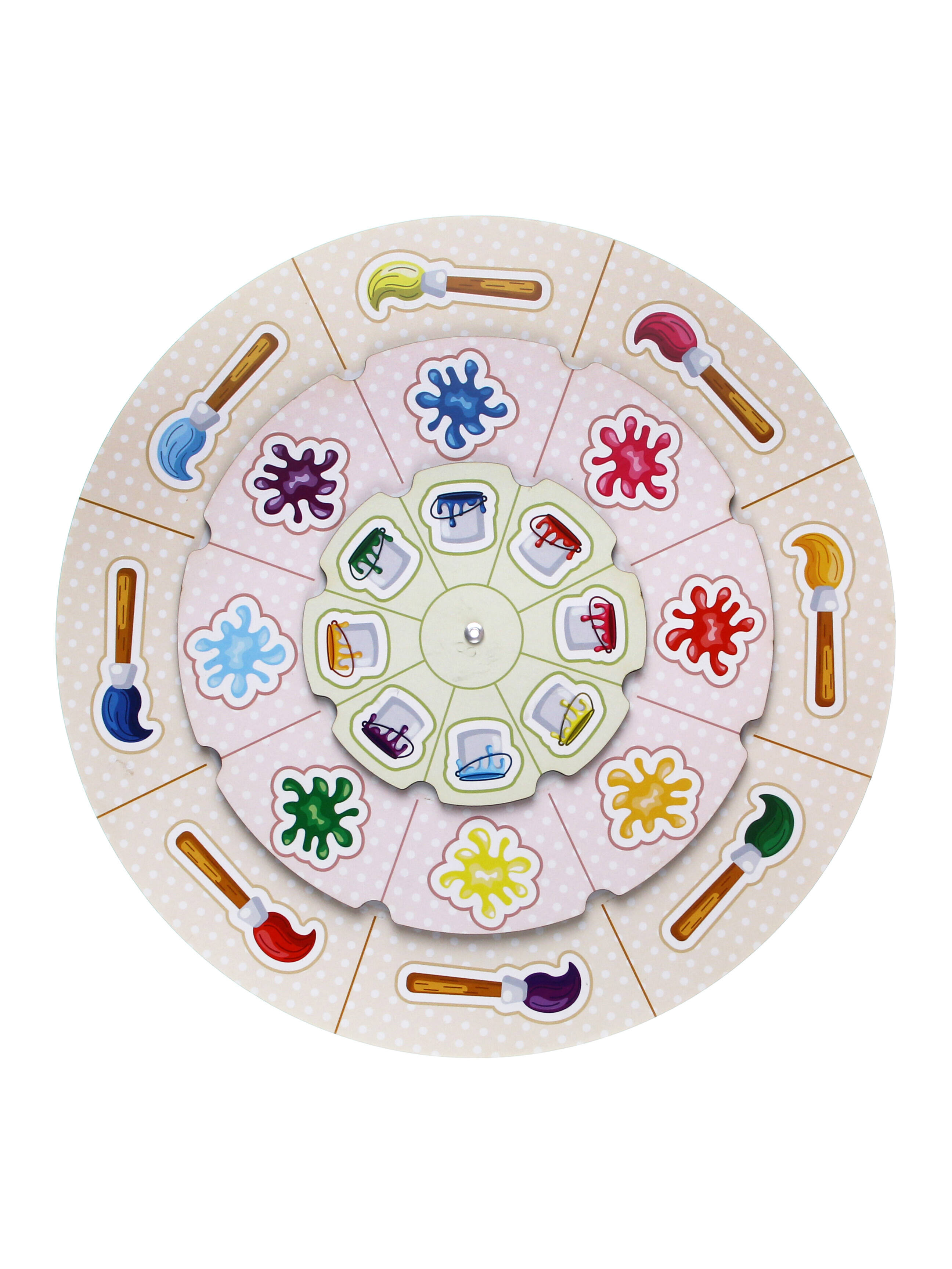 Игра состоит из трёх кругов разного диаметра, соединённых в центре. Каждый круг подвижен и разделен на сектора. На нижнем кольце изображены кисточки с ворсом разного цвета, на среднем - кляксы разного цвета , а сверху - ведерки с краской разных цветов.Задача ребенка подобрать соответствующие сектора на кругах. Развивают логическое и пространственное мышление, воображение, любознательность и творческие способности.| Издательство | 273a8449-4087-11ec-80c5-0050569a365d |