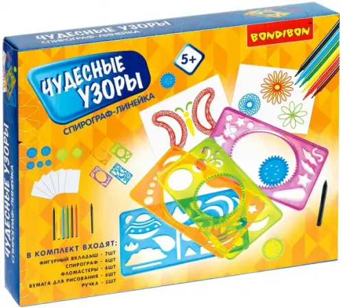 В комплект входят: фигурный вкладыш (7 штук), спирограф (4 штук), фломастеры (6 штук), бумага для рисования (6 штук), ручка.
