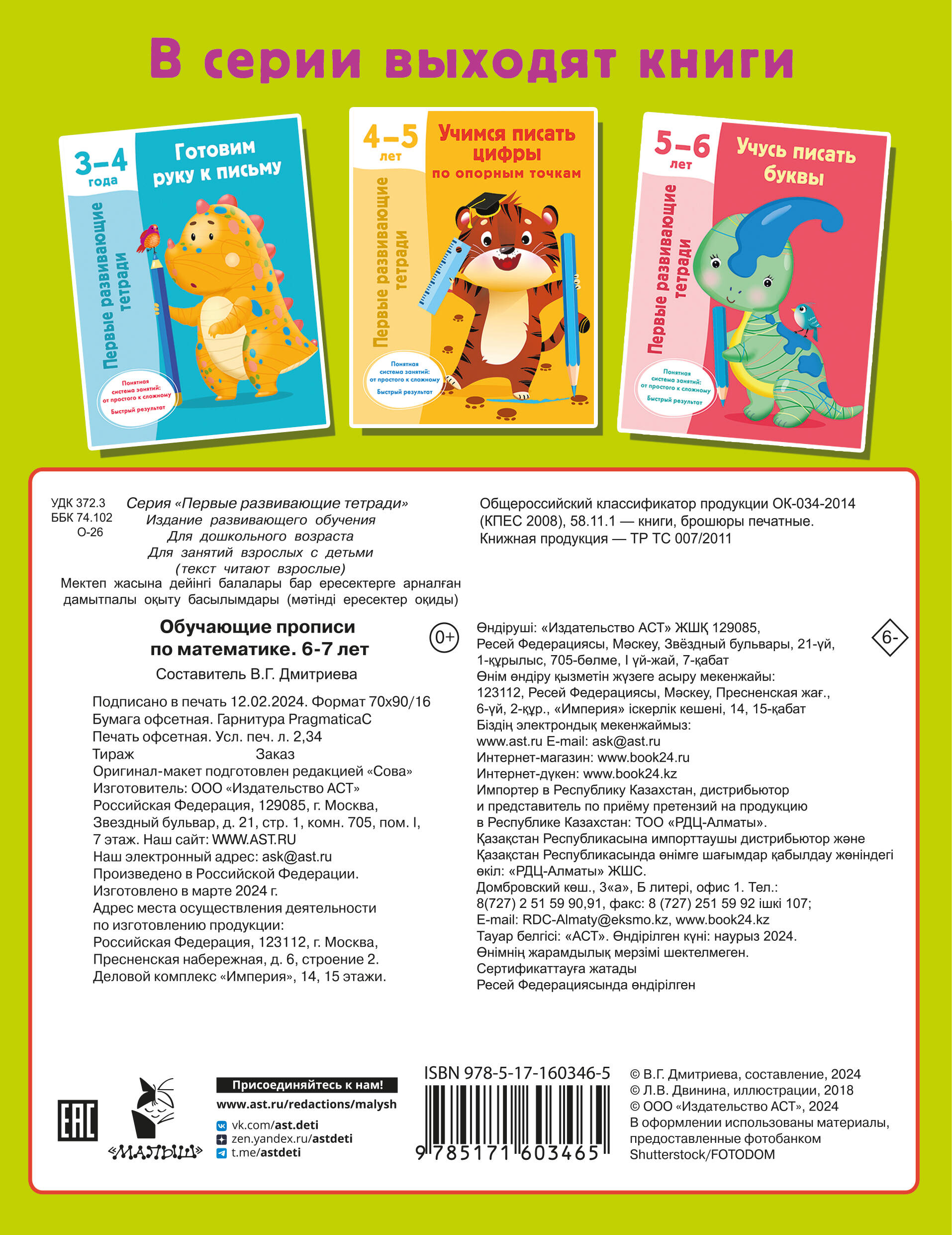 В серии «Первые развивающие тетради» - книги для любознательных малышей и заботливых родителей. Рабочая тетрадь «Обучающие прописи по математике. 6-7 лет» представляет интерес для будущих первоклассников, а также их родителей, - игровые задания развивают интеллект, формируют математические представления и ориентацию в пространстве, закрепляют правила выполнения простых арифметических действий. Приобретая это пособие для своего ребёнка, вы поможете ему: • подготовить руку к письму, научиться держать ручку и карандаш; • запомнить правильное начертание цифр; • потренироваться в сложении и вычитании; • развить мышление, логику, внимание, память; • стать более усидчивым и аккуратным.| Издательство | Издательство "АСТ" |