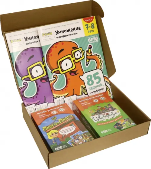 Самый полный набор, чтобы запомнить таблицу умножения! Две обучающие тетради, в которых более 400 примеров и две увлекательные настолки, чтобы полезно провести время всей семьёй. В набор входят: - "Умножение. 7-8 лет. Часть 1. 85 заданий + игра внутри!". Тетрадь, которая поможет ребенку самостоятельно и в интересной форме разобраться с принципами умножения. В тетради собраны 85 заданий, которые помогут ребёнку самостоятельно и в интересной форме разобраться с принципами умножения. Это позволяет не просто запомнить результат умножения чисел друг на друга, а понять, как это работает!