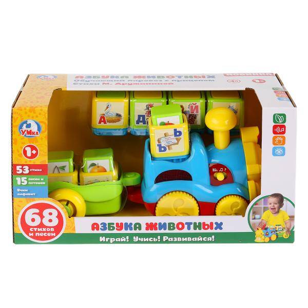 Обучающий паровоз на бат. со светом, ДРУЖИНИНА СТИХИ "Азбука животных"в русс. кор. Умка в кор.2*12шт