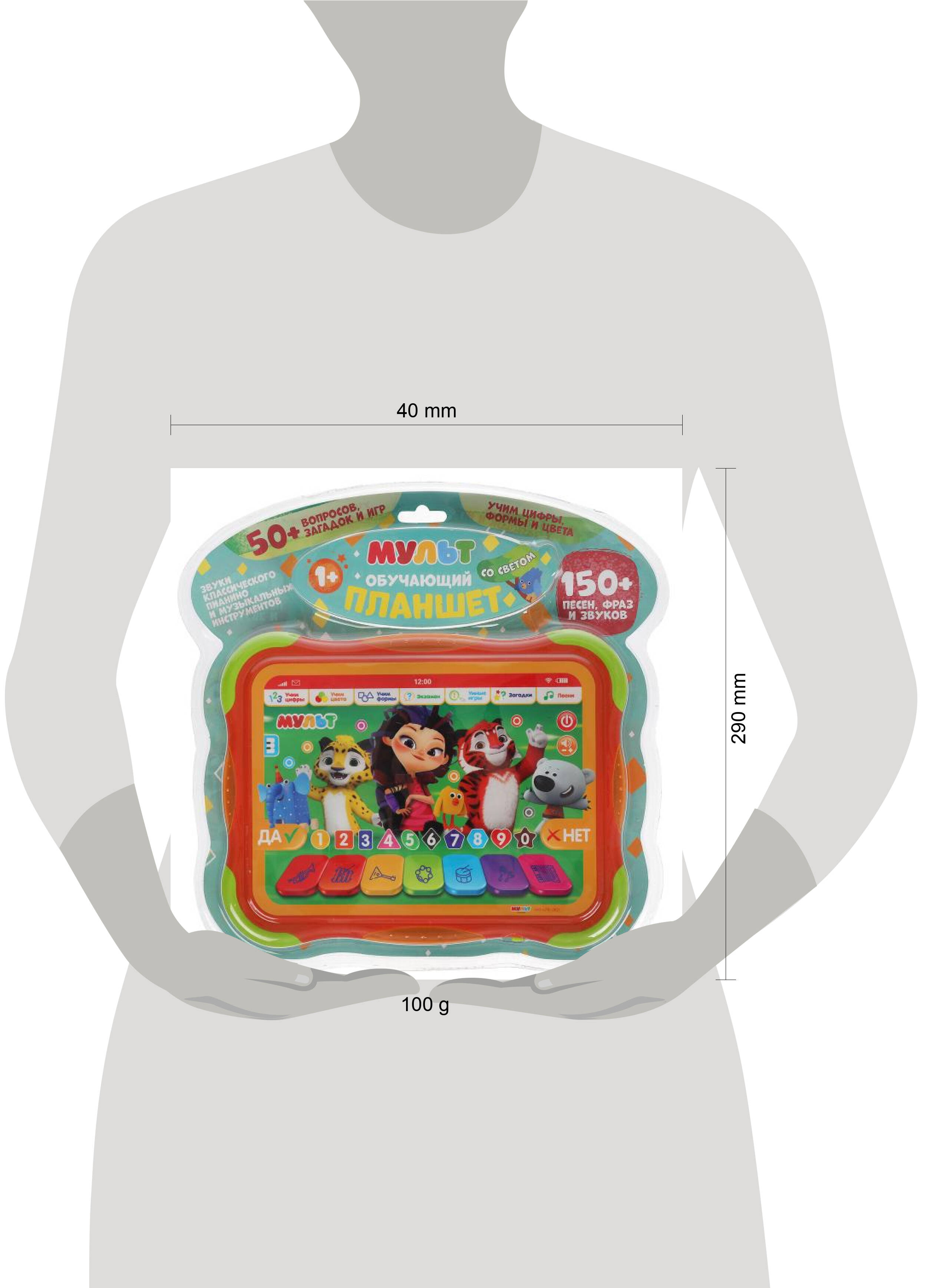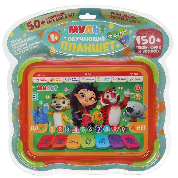 Обучающий планшет "Мульт" ТМ "УМка" станет прекрасным подарком для малыша: - 6 песен из м/ф: "Заставка" (Ми-ми-мишки), "Облака" (Ми-ми-мишки), "Оркестр" (Деревяшки), "Песенка слона" (Деревяшки), "Поверь в себя" (Сказочный патруль), "Птички пойте" (Лео и Тиг) - 10 загадок про формы - звуки классического пианино и музыкальных инструментов - игра "Да-нет" - световые эффекты - клавиши пианино - 7 режимов работы: "Учим цифры", "Учим цвета", "Учим формы", "Экзамен", "Умные игры", "Загадки", "Песни" - фигурные кнопки разных цветов - кнопки "Вкл./Выкл." - регулировка громкости Игрушка-планшет - креативный и полезный подарок для развития и игры. Такой планшет поможет ребёнку быстро и эффективно выучить цвета, цифры и формы. Малыш с удовольствием будет нажимать на кнопки и слушать песни из любимых мультфильмов, а также разгадывать загадки. Экзаменационный режим поможет легко проверить новые знания. А компактный размер позволяет повсюду брать игрушку с собой. Обучающий планшет ТМ "УМка" способствует расширению кругозора и развивает: - звуковое восприятие и музыкальный слух - память - мелкую моторику - фантазию - речь Размер: 24 х 19 х 4 см. Материал: пластмасса. Работает от 3-х батареек типа АА (в комплекте). Рекомендовано детям от 1 года.| Издательство | СИМБАТ ООО |