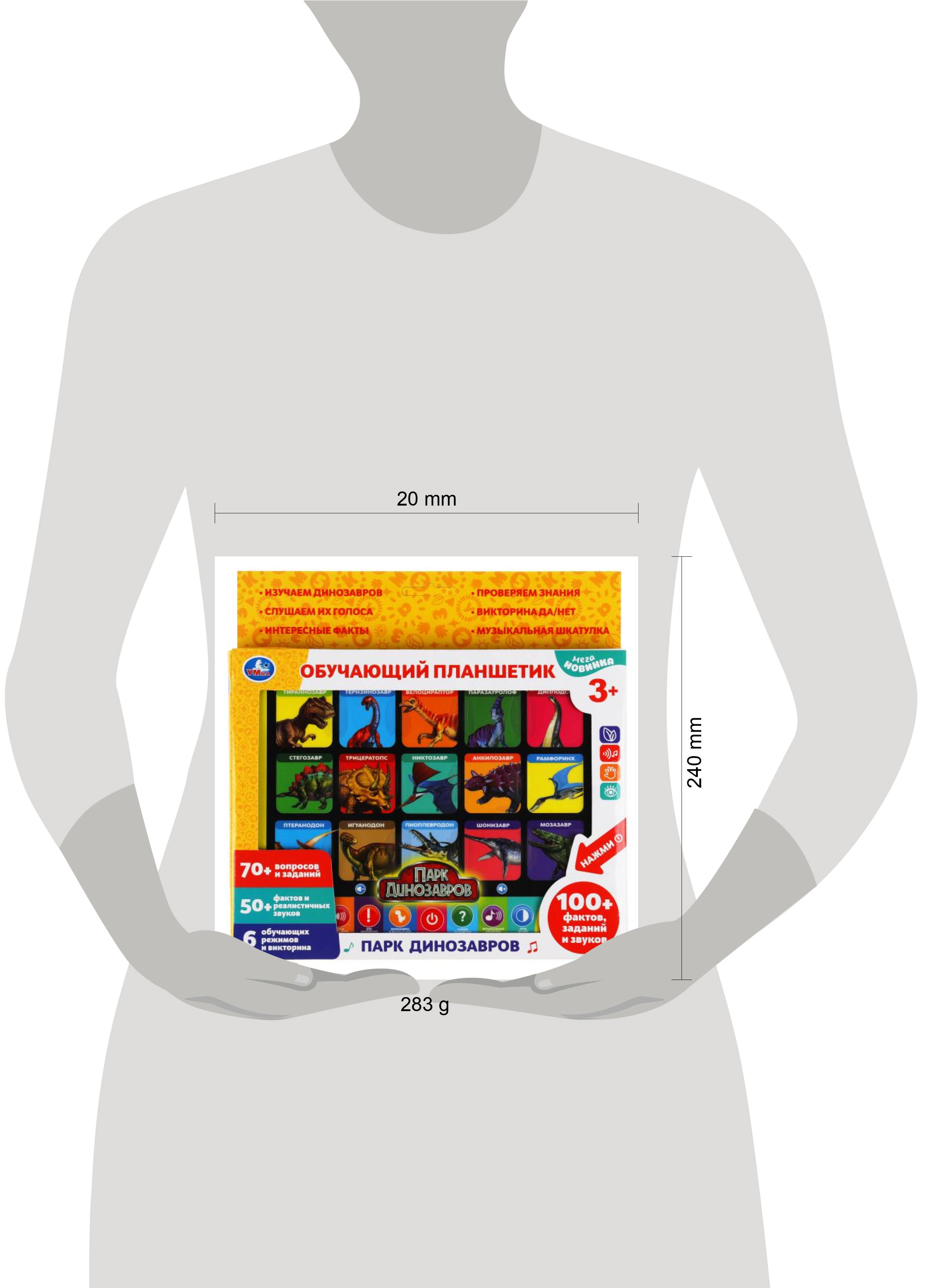 Обучающий планшет "Парк динозавров" ТМ "УМка" непременно понравится маленькому любознайке: - 100 фактов, заданий и звуков - 50 вопросов и заданий - 6 обучающих и игровых режимов: "Голоса динозавров", "Это интересно", "Динозавры и факты о них", "Найди динозавра", "Музыкальная шкатулка", "Игра ДА/НЕТ" - реалистичные голоса динозавров - песенка про динозавров - регулировка громкости Яркий планшет станет любимой игрушкой ребёнка. С ним можно играть и учиться. Удобный формат позволяет брать игрушку с собой в поездки. Игры с обучающим планшетом ТМ "УМка" помогают развить: - моторику - музыкальный слух - внимание - воображение - память Размер игрушки: 18 х 12 х 2 см. Материал: пластмасса. Работает от 3-х батареек типа АА (в комплекте). Рекомендовано детям от 3-х лет.| Издательство | СИМБАТ ООО |