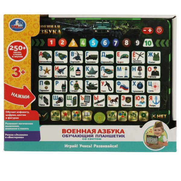 Аннотация: Обучающий планшетик Со светом ВОЕННАЯ азбука. 250 песен, стихов, звуков Умка в кор.36шт