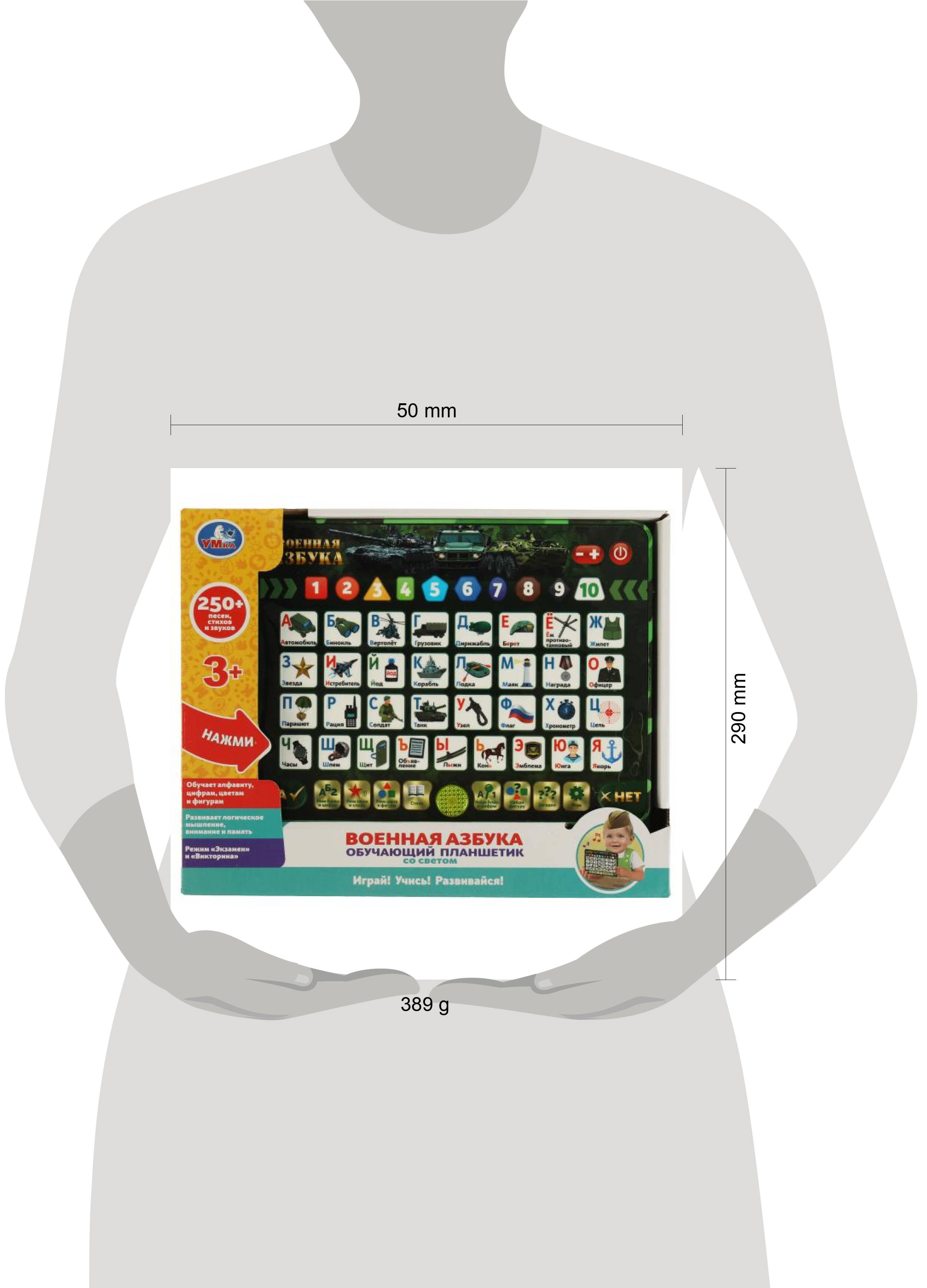 Обучающий планшетик со светом "Военная азбука" ТМ "УМка" станет прекрасным подарком для маленького героя: - 250+ песен, стихов и звуков - обучает алфавиту, цифрам, цветам и фигурам - Режим "Экзамен" и "Викторина" - световые эффекты - кнопка "Вкл./Выкл." - регулировка громкости Ваш малыш непременно полюбит этот планшет. С ним ребёнок быстро и эффективно выучит азбуку, цифры, цвета и формы. Малыш с удовольствием будет нажимать на кнопки, слушать любимые песни, интересные стихи и весёлые звуки. А экзаменационный режим поможет проверить новые знания. Обучающий планшет ТМ "УМка" способствует расширению кругозора и развивает: - звуковое восприятие и музыкальный слух - память - мелкую моторику - фантазию - речь Размер: 25 х 19 х 3 см. Материал: пластмасса + металл. Работает от 3-х батареек типа ААА (в комплекте). Рекомендовано детям от 3-х лет.| Издательство | С-Маркет ООО |