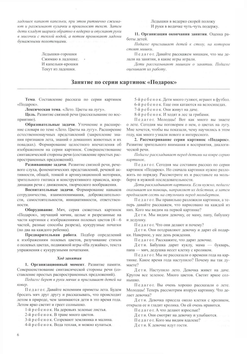 В организации образовательной деятельности по развитию речи, в соответствии с Федеральным образовательным стандартом, в дошкольных образовательных учреждениях центральное место отводится формированию у детей связной речи и речевого общения. Именно связная речь обеспечивает общение и взаимопонимание людей. Формирование связной речи является следствием усложняющейся деятельности ребенка и напрямую связано с развитием мышления. К концу дошкольного возраста ребенок овладевает всеми формами устной речи: диалогической и монологической, контекстной и ситуативной. Монологическая речь более сложна, чем диалогическая, и отличается развернутостью, сложностью в лингвистическом отношении, предполагает использование полных, распространенных предложений. Формированию навыков рассказывания в детском саду уделяется особое внимание. Уже с трехлетнего возраста детей обучают связным высказываниям, начинают подготовку к овладению двумя типами устной монологической речи: пересказу и рассказу. Постепенно ребенка необходимо научить определять содержание рассказа и выбирать форму повествования, систематизировать материал и излагать его в нужной последовательности. В настоящей тетради представлены серии картинок и примерные конспекты интегрированных занятий с детьми старшего дошкольного возраста, с пяти до шести лет. Рассказывание по серии картинок является очень эффективным видом работы по формированию связной речи. Оно исключает этап составления плана, так как порядок чередования картинок определяет последовательность изложения, что позволяет сэкономить время и опросить большее количество детей. В процессе обучения детей рассказыванию по серии картин необходимо сформировать у детей элементарные представления о структуре текста, о том, что любой рассказ имеет начало, середину и конец. Важно, чтобы дети на шестом году жизни научились по-разному начинать рассказы, овладели многообразием форм зачинов, умели сжато и лаконично передать суть происходящего, предлагали разнообразные варианты окончания рассказа. Все это готовит дошкольников к становлению самостоятельного словесного творчества. На первом этапе обучения рассказыванию по серии картин целесообразно использовать прием завершения детьми рассказа, начатого педагогом. Применение этого приема способствует развитию творческих способностей и фантазии детей, особенно если педагог предлагает несколько вариантов начала рассказа. Залогом успеха при обучении рассказыванию по серии картин является осмысление детьми общего содержания изображенных событий. В конечном итоге у детей должно быть сформировано целостное впечатление о них. Важно, чтобы при обучении детей рассказыванию педагог не прибегал к авторитарному стилю общения, не навязывал свою точку зрения. Необходимо учитывать сферу развития общения дошкольников друг с другом и со взрослыми, опираться на индивидуальные особенности детей. Это в полной мере позволит решить задачи развития связной речи, коммуникативных навыков, поможет сформировать у детей культуру общения. Для работы нужно извлечь цветную вкладку из книги и разрезать ее.| Издательство | Детство-Пресс |