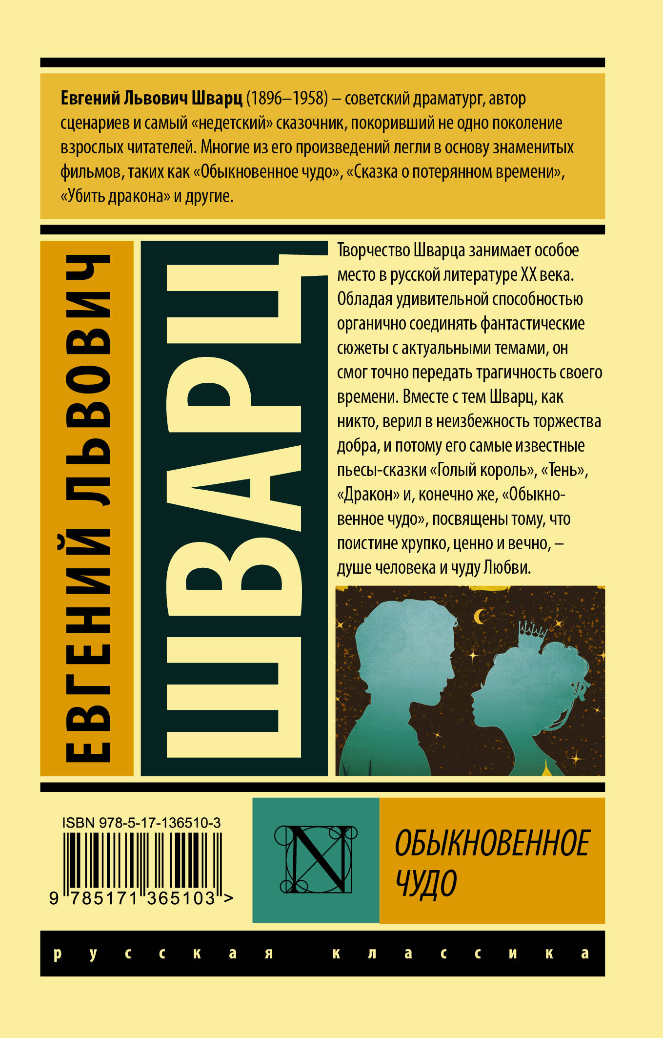 Творчество Шварца занимает особое место в русской литературе ХХ века. Обладая удивительной способностью органично соединять фантастические сюжеты с актуальными темами, он смог точно передать трагичность своего времени. Вместе с тем Шварц, как никто, верил в неизбежность торжества добра, и потому его самые известные пьесы-сказки "Голый король", "Тень", "Дракон" и, конечно же, "Обыкновенное чудо", посвящены тому, что поистине хрупко, ценно и вечно, - душе человека и чуду Любви.| Издательство | ИЗДАТЕЛЬСТВО "АСТ" |
