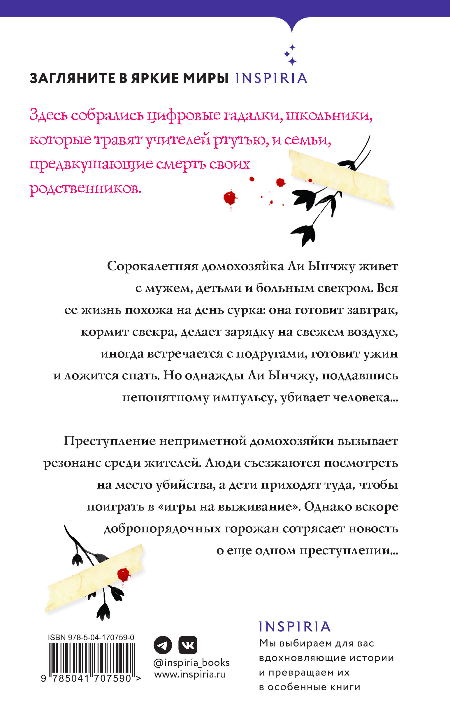 ПОБЕДИТЕЛЬ 9-Й НАЦИОНАЛЬНОЙ ЛИТЕРАТУРНОЙ ПРЕМИИ КОРЕИ. Смерть - не трагедия, а лишь повод для сплетен. Сорокалетняя домохозяйка Ли Ынчжу живет с мужем, детьми и больным свекром. Вся ее жизнь похожа на день сурка: она готовит завтрак, кормит свекра, делает зарядку на свежем воздухе, иногда встречается с подругами, готовит ужин и ложится спать. Но однажды Ли Ынчжу, поддавшись непонятному импульсу, убивает человека... Преступление неприметной домохозяйки вызывает резонанс среди жителей. Люди съезжаются посмотреть на место убийства, а дети приходят туда, чтобы поиграть в «игры на выживание». Однако вскоре добропорядочных горожан сотрясает новость о еще одном преступлении... Антидетектив об иррациональных убийствах и странных происшествиях в обыкновенном корейском городе. Здесь собрались цифровые гадалки, школьники, которые травят учителей ртутью, и семьи, предвкушающие смерть своих родственников.| Издательство | ООО "Издательство "Эксмо" |