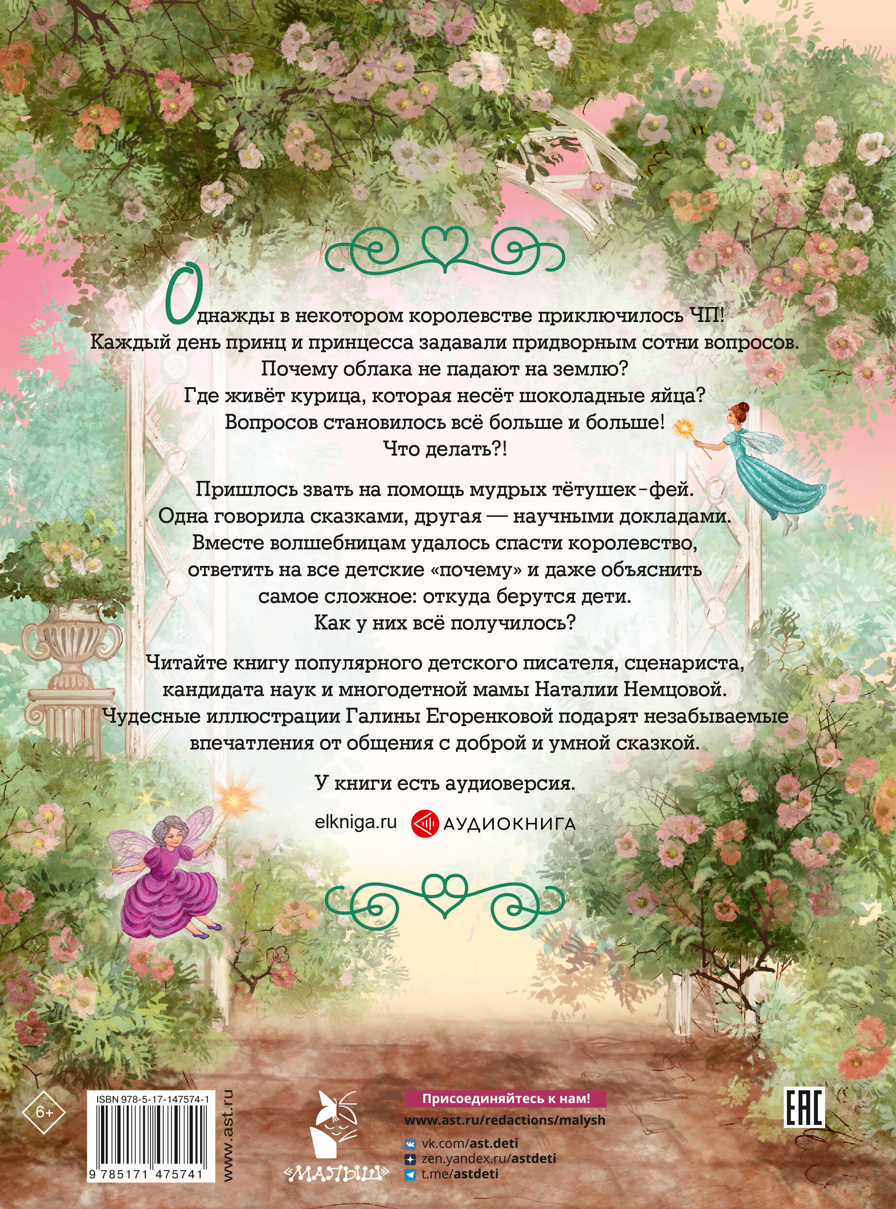 Чем похожи все счастливые семьи? Конечно, тем, что в них царят согласие и любовь. В доброй и весёлой сказке популярного детского писателя, сценариста, кандидата наук и многодетной мамы Наталии Немцовой маленькие почемучки познакомятся с дружной королевской семьёй, в которой однажды приключилось ЧП! На короля, королеву и всех придворных обрушился шквал самых неожиданных вопросов принца и принцессы. Откуда берутся дети? Где достать братика или сестричку? Почему рождаются двойняшки? Как ребёнок помещается в животике у мамы? Мудрым тётушкам-феям удалось невозможное. Они доступно и понятно ответили на сложные детские почему. И в королевскую семью вернулись спокойствие и взаимопонимание. Теперь у всех родителей есть надёжный помощник - детская энциклопедия в сказках, в которой много обыкновенных и невероятных фактов о рождении человека. Обсуждение непростых вопросов детей пройдёт легко, без обмана, без «неприличных» моментов, правдиво, по делу и при этом увлекательно. Чудесные иллюстрации Галины Егоренковой, показывающие королевское родословное древо, старинные замки, отважных рыцарей и красавиц-принцесс, превращают книгу в прекрасный подарок малышу.| Издательство | Издательство "АСТ" |