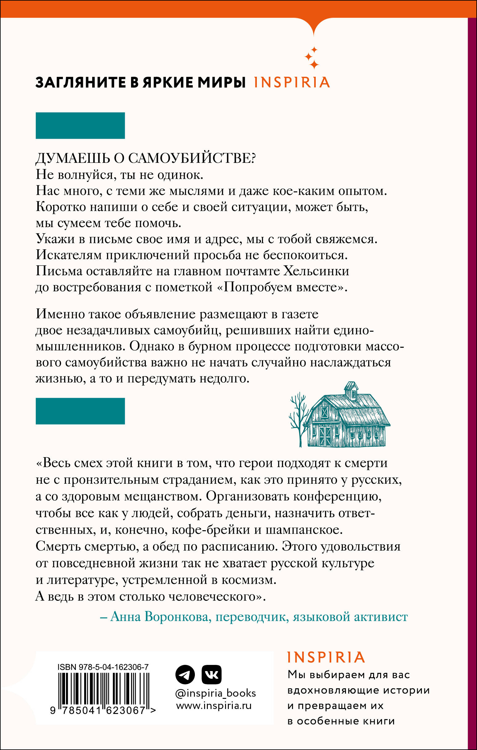 «ДУМАЕШЬ О САМОУБИЙСТВЕ? Не волнуйся, ты не одинок. Нас много, с теми же мыслями и даже кое-каким опытом. Коротко напиши о себе и своей ситуации, может быть, мы сумеем тебе помочь. Укажи в письме свое имя и адрес, мы с тобой свяжемся. Сведения обрабатываются в режиме строгой конфиденциальности и не передаются посторонним. Искателей приключений просьба не беспокоиться. Письма оставляйте на главном почтамте Хельсинки до востребования с пометкой "Попробуем вместе"». Именно такое объявление размещают в финской газете двое незадачливых самоубийц, решивших найти единомышленников и подойти к организации дела с финской практичностью. Вскоре желающих вступить в «клуб по интересам» набивается целый автобус, - очень кстати, ведь столько всего нужно продумать и спланировать. Главное в бурном процессе подготовки массового самоубийства - не начать случайно наслаждаться жизнью, а то так и передумать недолго.| Издательство | ООО "Издательство "Эксмо" |