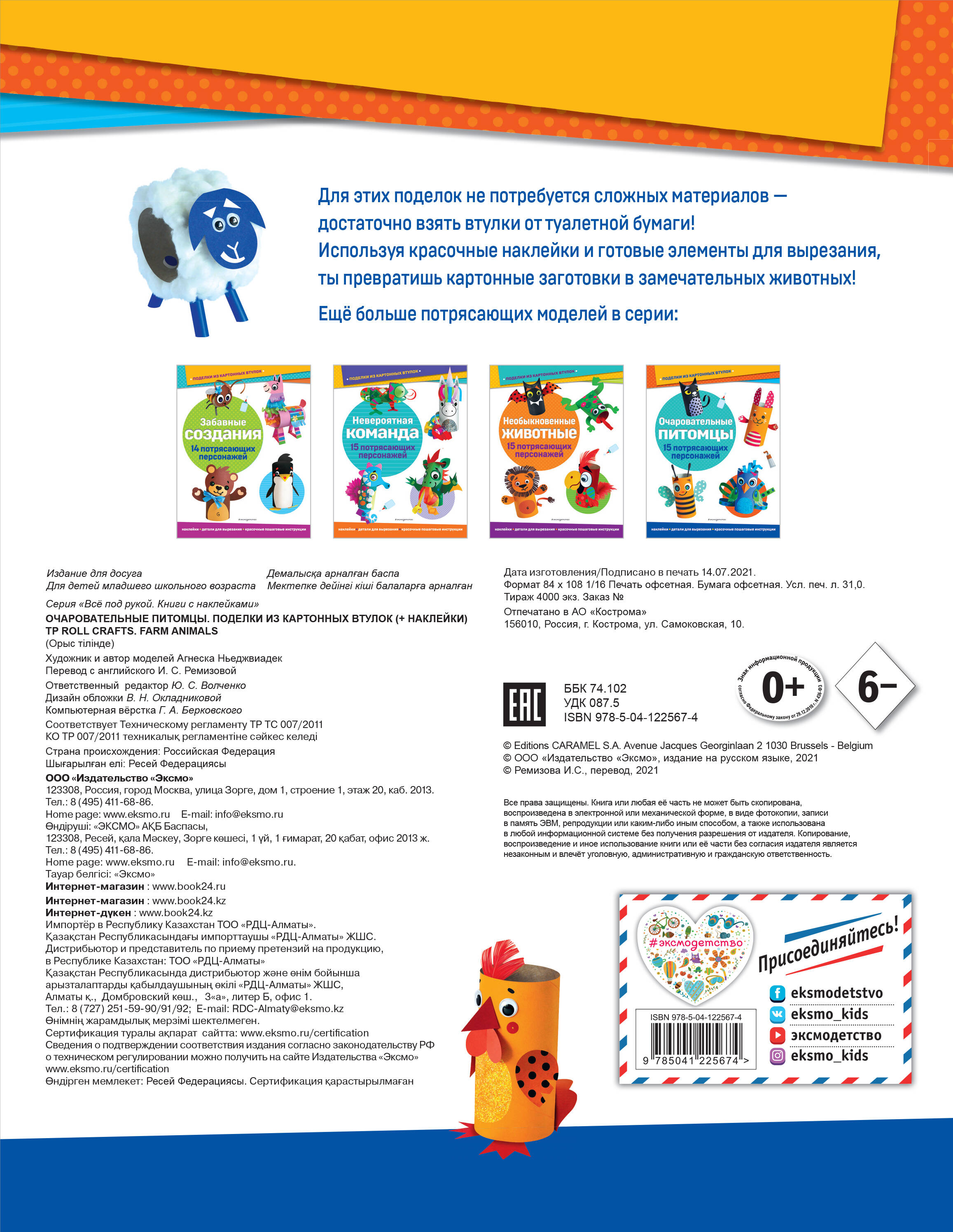 Для этих поделок не потребуется сложных материалов - достаточно взять втулки от туалетной бумаги! Используя красочные наклейки и готовые элементы для вырезания, ты превратишь картонные заготовки в замечательных зверят! 15 потрясающих персонажей, красочные пошаговые инструкции.| Издательство | ООО "Издательство "Эксмо" |