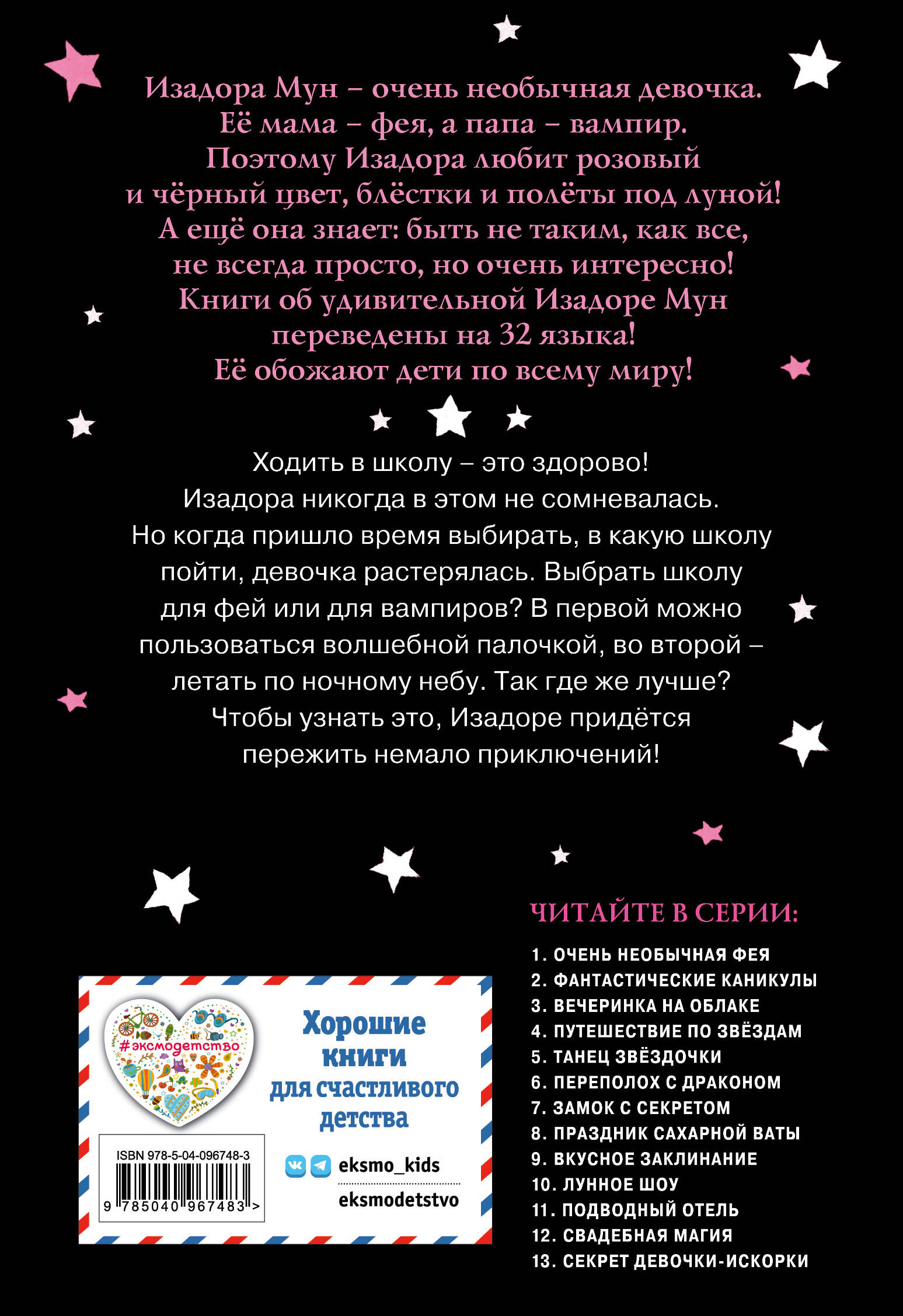 Изадора Мун - очень необычная девочка! Она обожает розовый и чёрный цвет, умеет летать и пользоваться волшебной палочкой. Её мама - фея, а папа - вампир! Поэтому Изадора знает: быть не таким, как все, не всегда просто, зато ужасно интересно! Но когда пришло время выбрать себе школу, Изадора растерялась: куда же ей пойти - в школу для фей или для вампиров? И там, и там девочку ждёт много испытаний. Но главное - не бояться быть таким, какой ты есть. И тогда всё получится! Гарриет Манкастер - всемирно известная писательница, книги которой переведены на 32 языка! А также талантливый иллюстратор - её чёрно-розовые иллюстрации делают истории ещё интереснее! Книги об Изадоре добрые, весёлые, увлекательные. Но главное - они помогают каждому ребёнку поверить в себя! В конце маленьких читателей ждут весёлые игры!| Издательство | ООО "Издательство "Эксмо" |