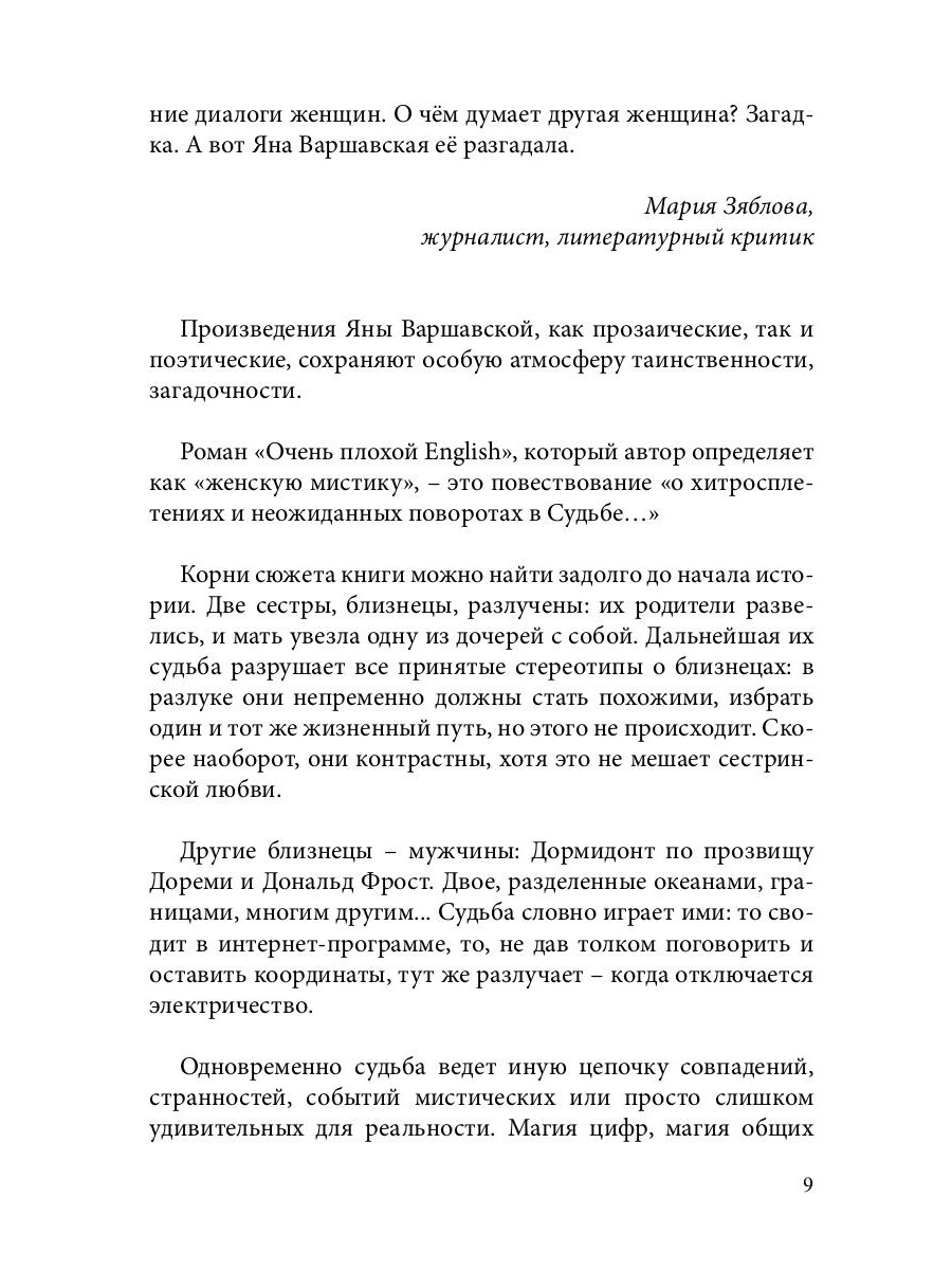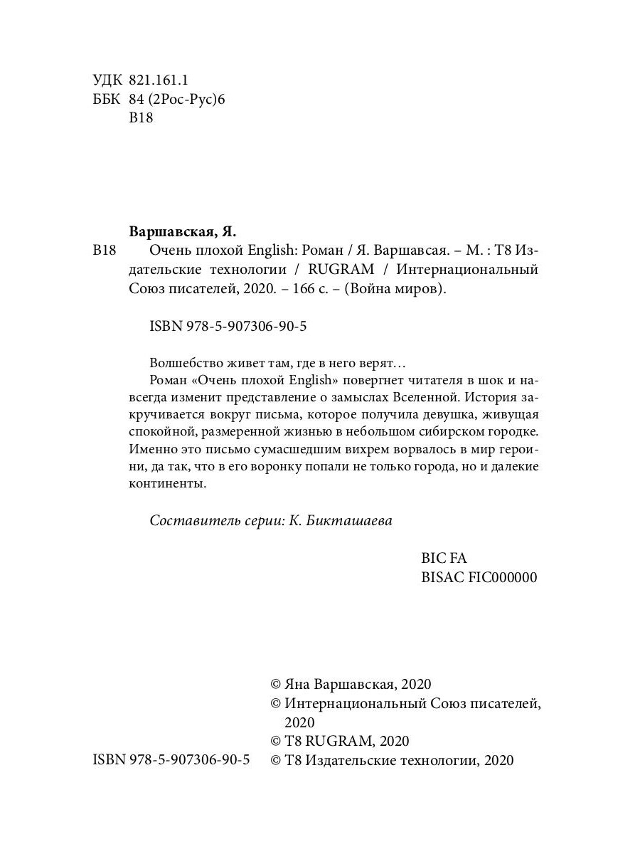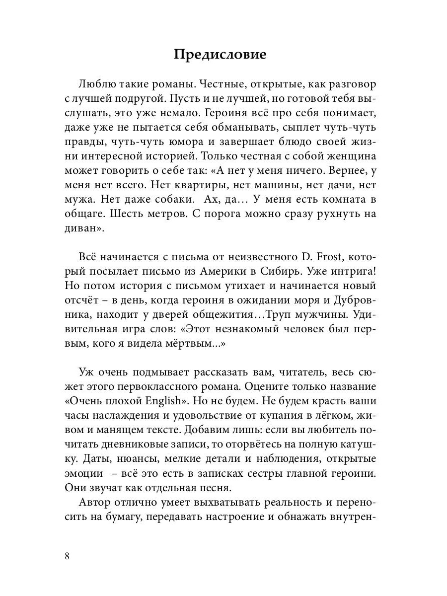 Роман «Очень плохой English» повергнет читателя в шок и навсегда изменит представление о замыслах Вселенной. История закручивается вокруг письма, которое получила девушка, живущая спокойной, размеренной жизнью в небольшом сибирском городке. Именно это письмо сумасшедшим вихрем ворвалось в мир героини, да так, что в его воронку попали не только города, но и далекие континенты.